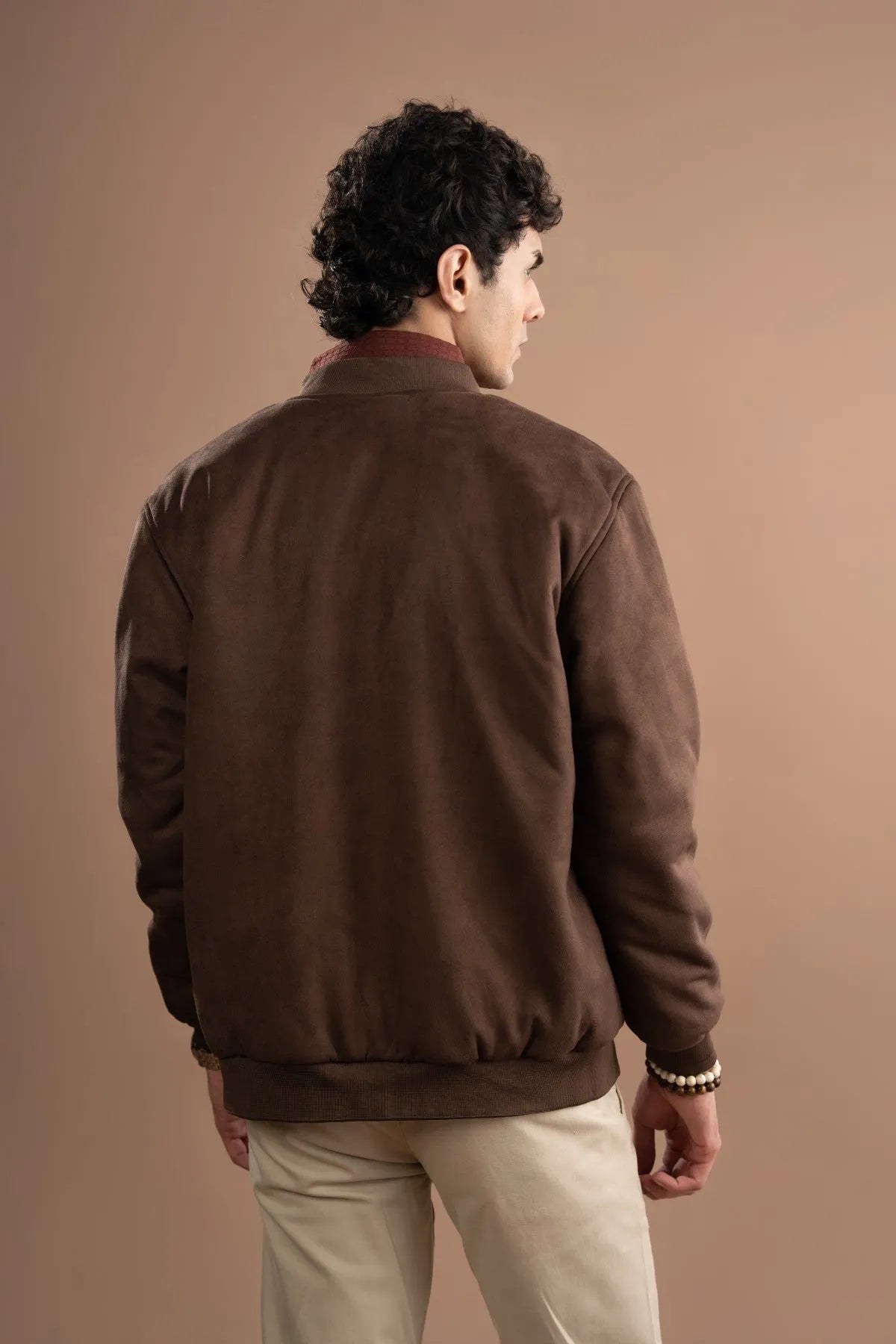 Bomber jacket comes in a chocolate brown color and is made from 100% polyester microfiber faux suede, which has a little stretch for movement. The jacket features a classic ribbed band collar, ribbed sleeve cuffs, and is cut to a regular length. It closes cleanly with a front metal zipper, and includes functional diagonal bon pockets on the front. For comfort, the interior is finished with a smooth 70 GSM inner silk lining and a handy inner pocket for your essentials.