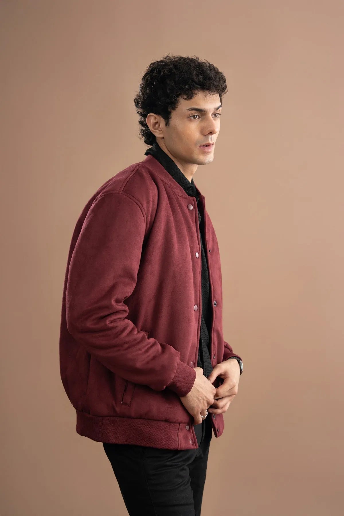 This suede bomber jacket comes in a deep, sharp windsor wine and is made from 100% polyester microfiber faux suede. It features a regular fit with full sleeves and a classic ribbed ban collar. The design stays clean and secure with 1:1 ribbed cuffs on the sleeves and a matching ribbed hem at the bottom. It closes easily with snap buttons and includes useful diagonal bon pockets on the front, plus a secure Inner Pocket inside. A smooth inner silk lining makes it comfortable and easy to wear.