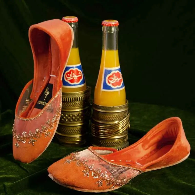 A luminous veil of net with hand placed floral work in zari and beads on a khussa. The V neckline frames the foot while a cushioned insole and flexible leather sole make long events easy.