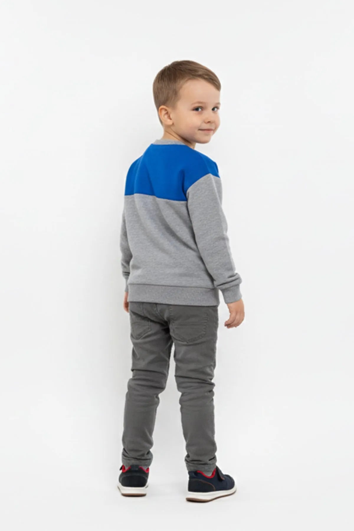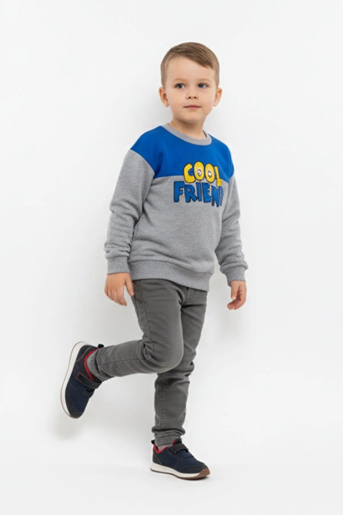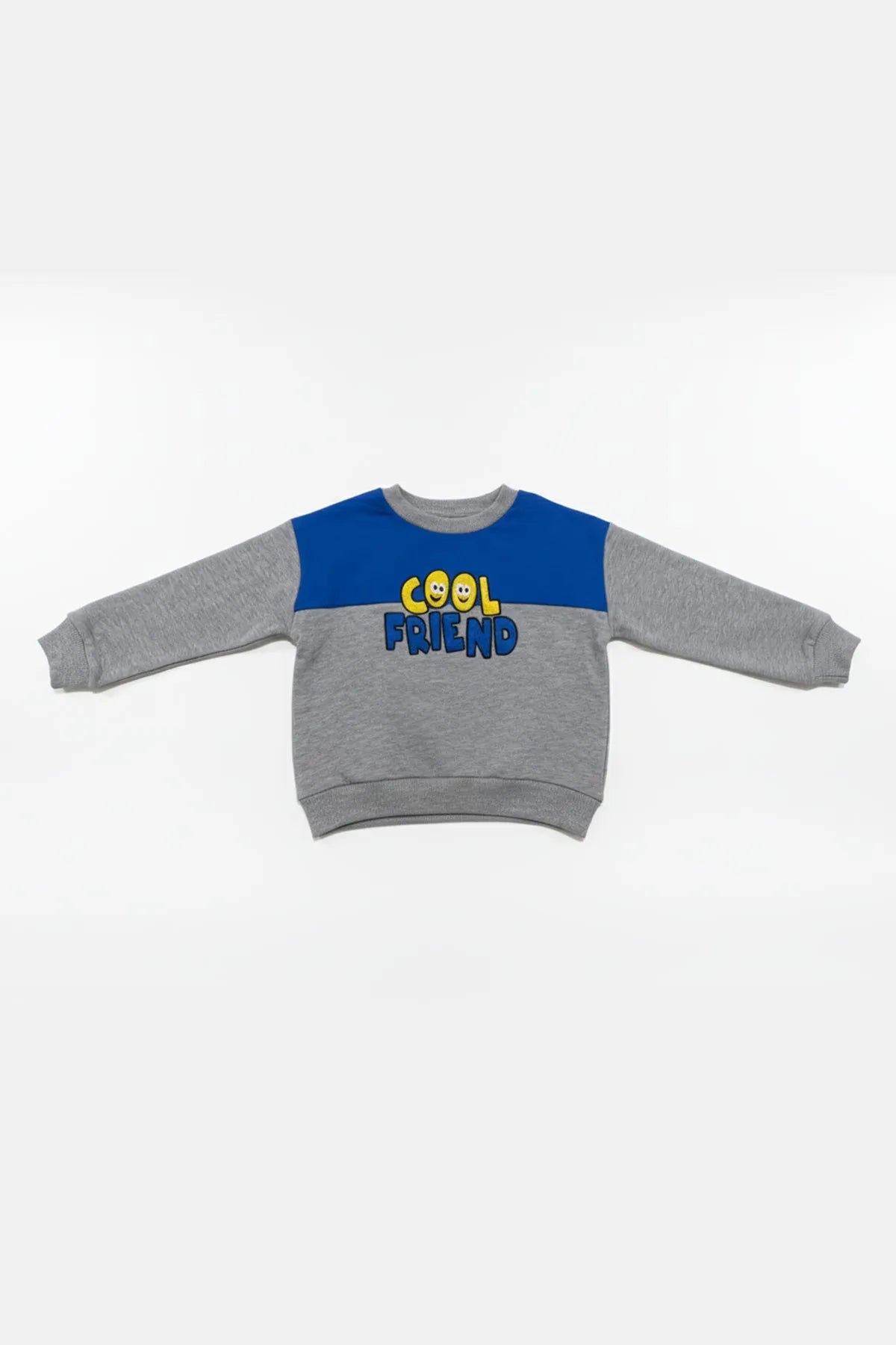 This cozy sweatshirt for boys features a fun “Cool Friend†embroidered graphic on a soft grey base with a bold blue panel across the chest. Made from warm and breathable fabric, it offers all-day comfort and a relaxed fit.
