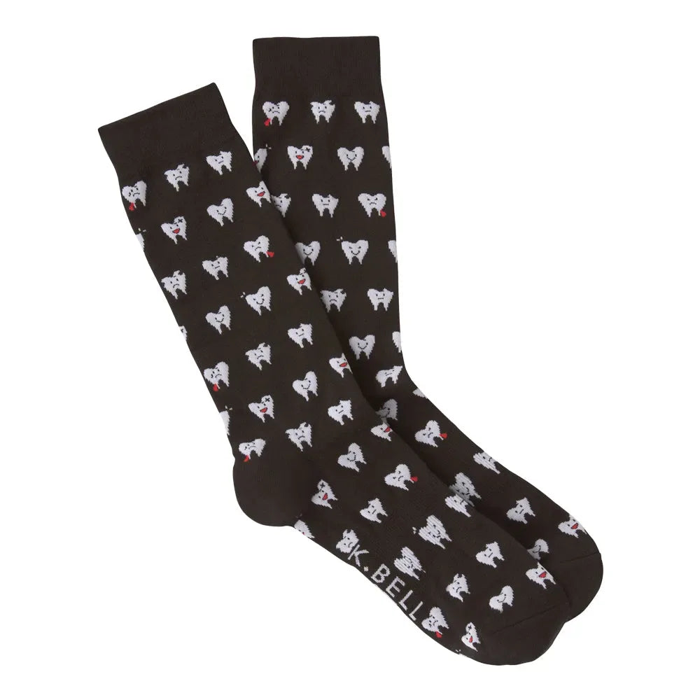 Take on the dentist like a pro in these Teeth socks. This pair of flat knit black socks for men feature an allover tooth print, each tooth with their own personality, plus ribbed trim. These funny novelty socks are sure to make you smile!