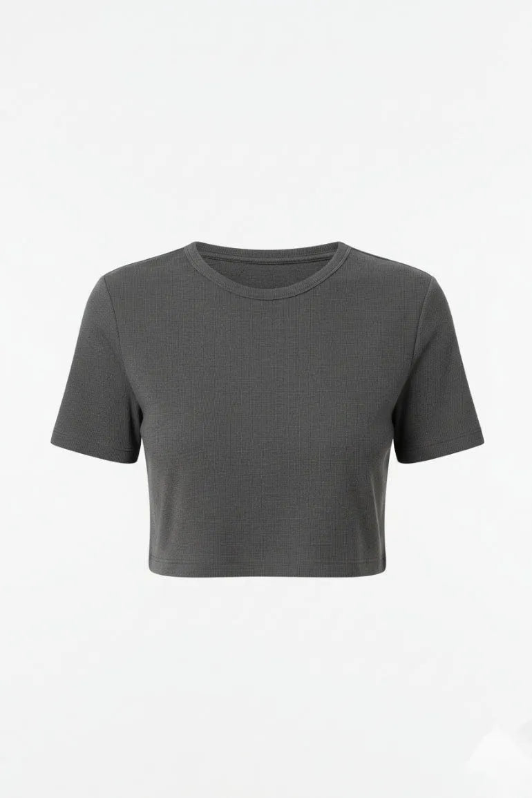 A modern cropped T-shirt crafted in a subtle textured fabric for a clean, elevated look. Soft, breathable, and easy to style, perfect for everyday casual wear or athleisure outfits.