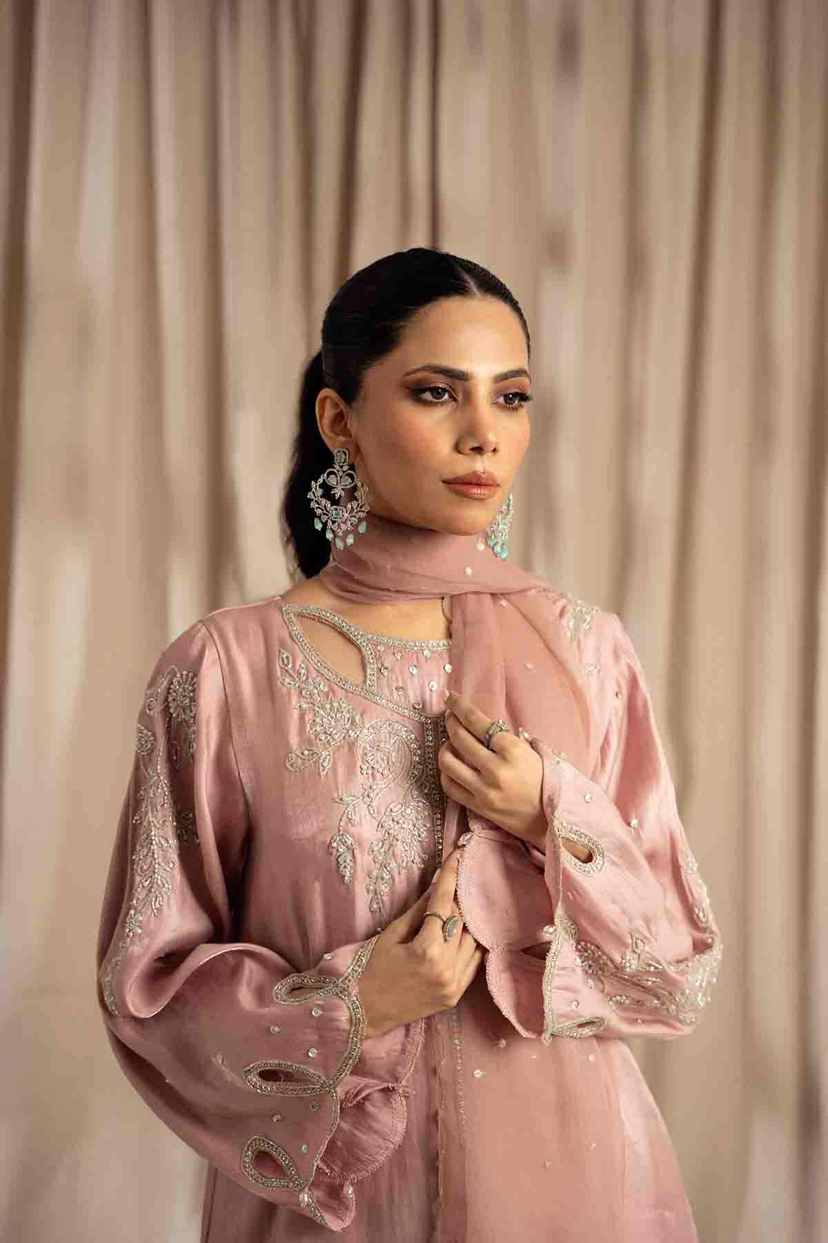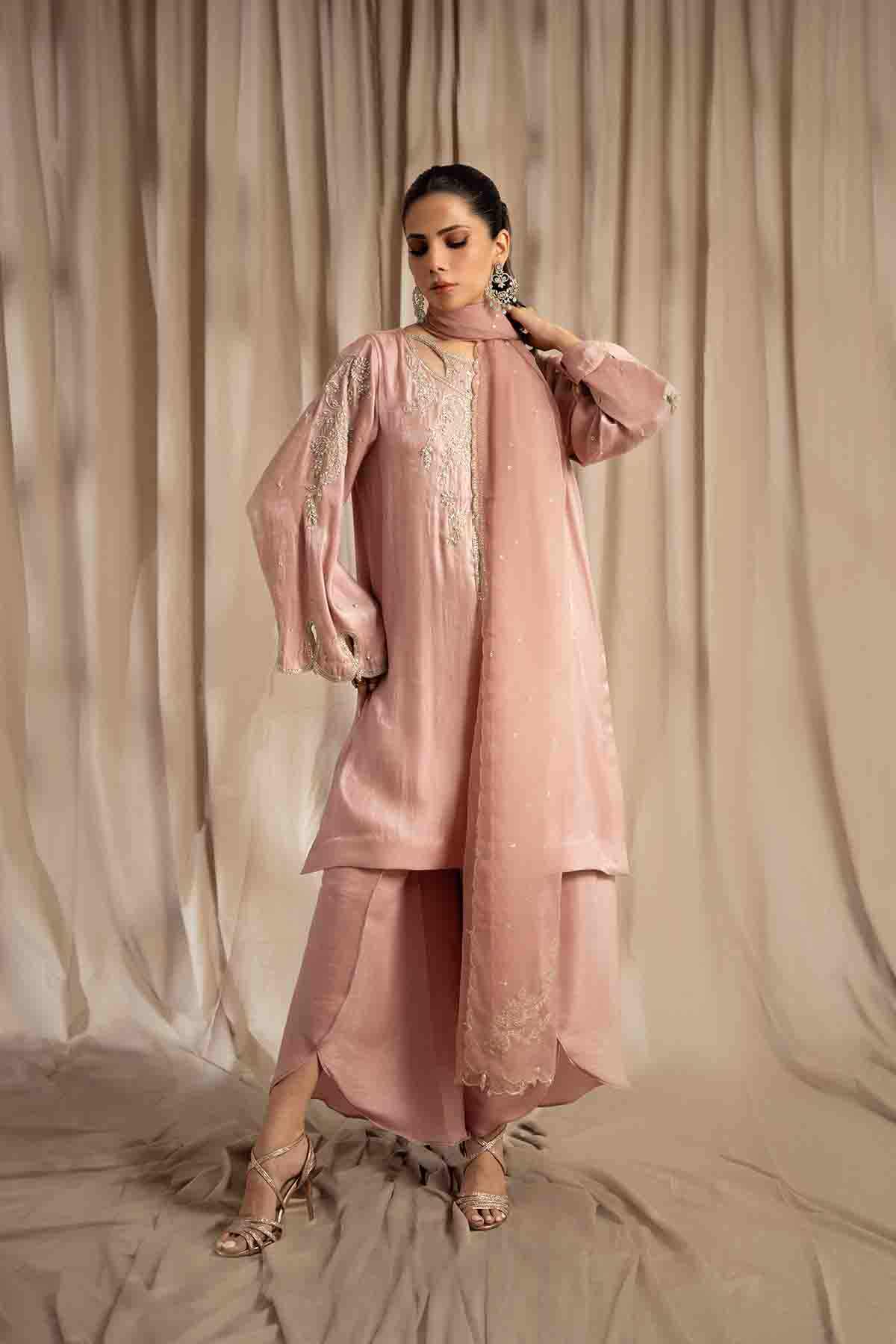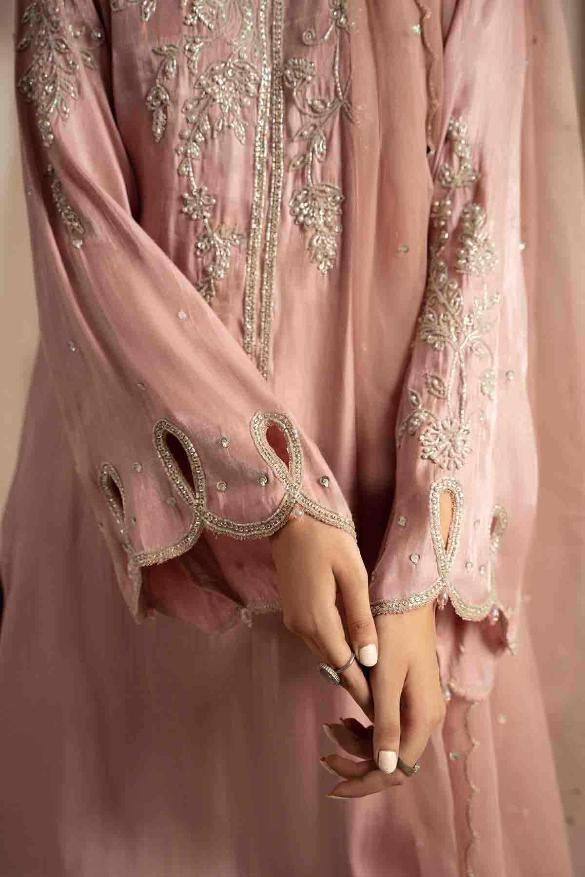 LIA - Festive Formal: The Ensemble Features A Tea Pink Sheesha Silk Short Shirt Embellished With Intricate Contrasting Light Grey Hand Embroidery Of Bead, Sequins, Pearl And Cutwork. Paired With Overlapped Flared Trouser And Organza Dupatta Adorned With Hand Embroidery With Makes It The Perfect Choice For Any Occasion.