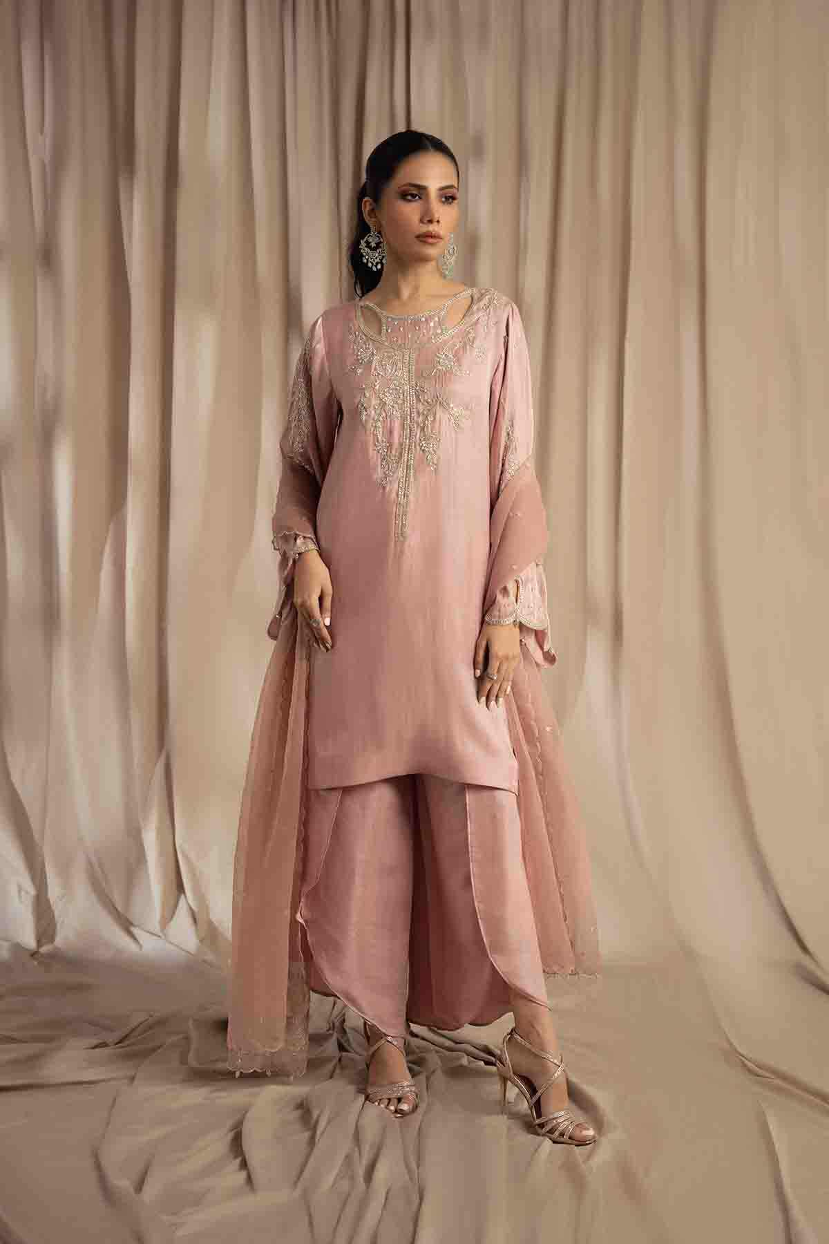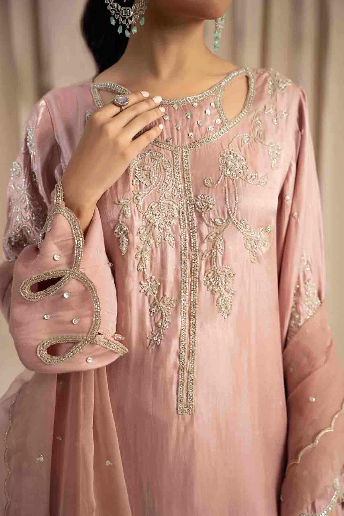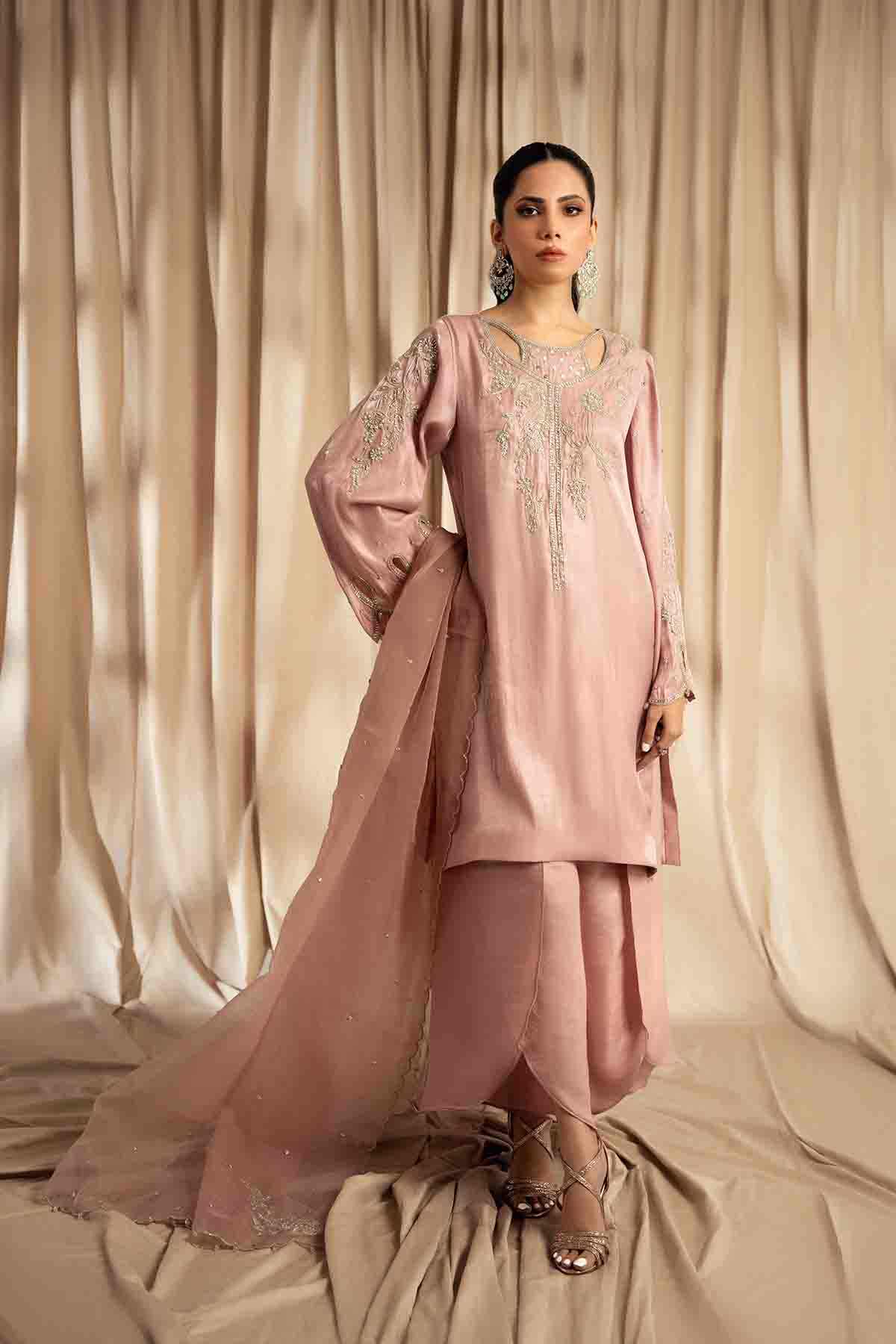 LIA - Festive Formal: The Ensemble Features A Tea Pink Sheesha Silk Short Shirt Embellished With Intricate Contrasting Light Grey Hand Embroidery Of Bead, Sequins, Pearl And Cutwork. Paired With Overlapped Flared Trouser And Organza Dupatta Adorned With Hand Embroidery With Makes It The Perfect Choice For Any Occasion.