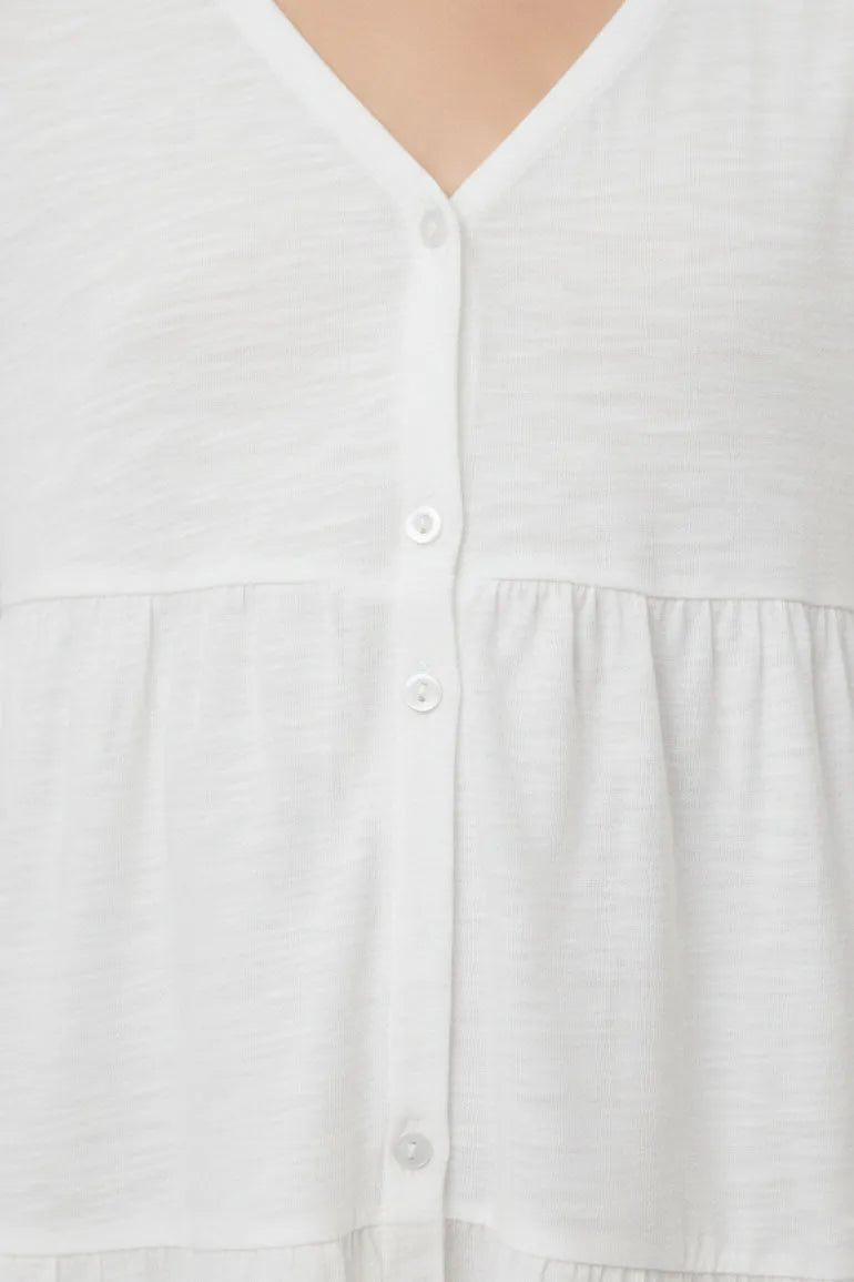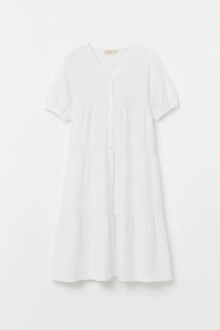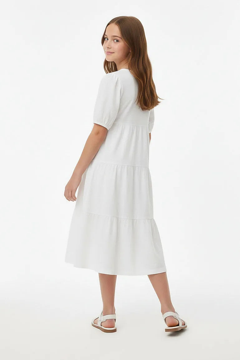 Elegant white tiered dress for girls designed with soft puff sleeves and a flowy silhouette. Crafted from lightweight, breathable fabric for all-day comfort. Perfect for casual wear, summer outings, and special occasions.
