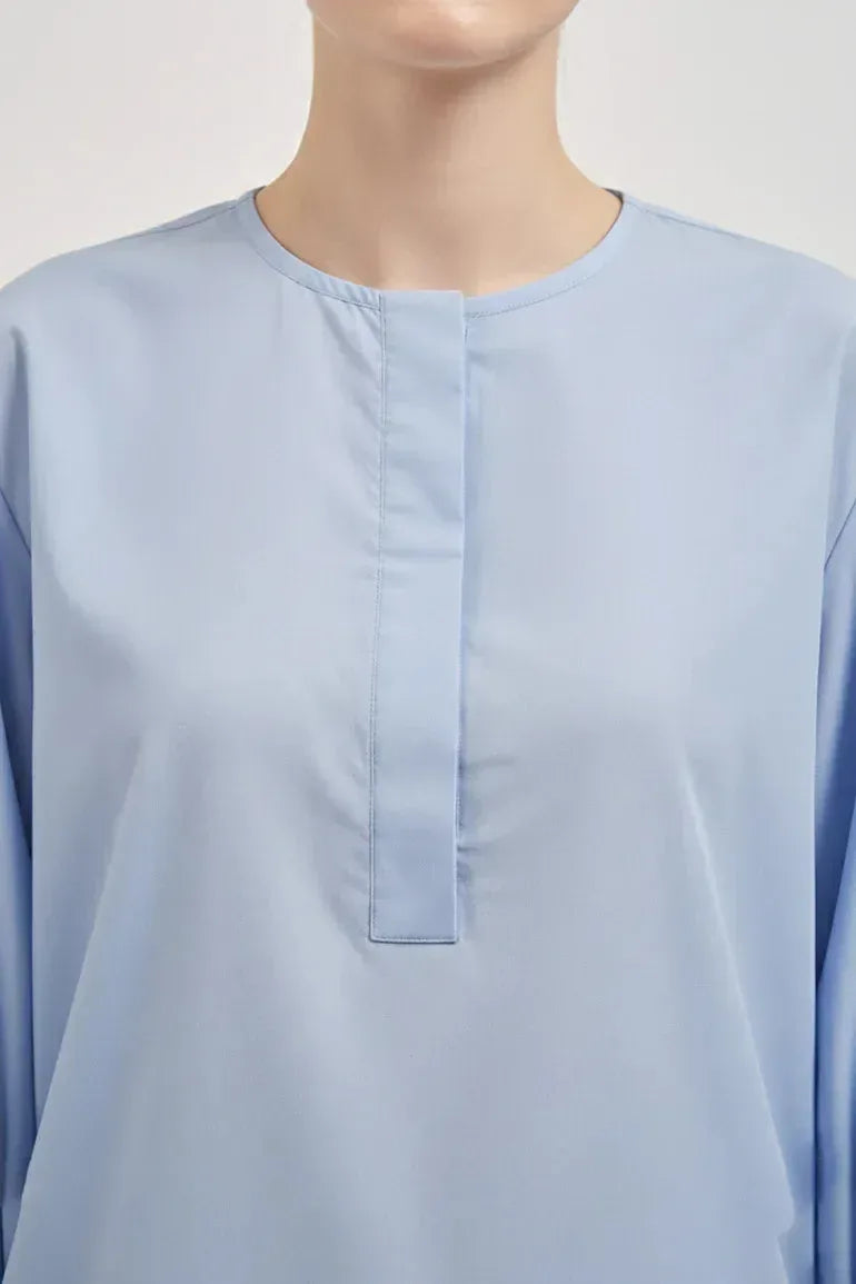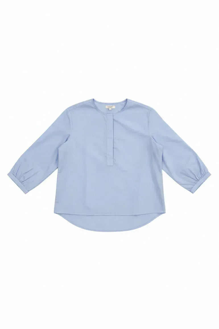 An effortless wardrobe staple in a soft sky-blue hue. Crafted from premium cotton poplin, this top features a clean band collar, half-placket front, and relaxed drop shoulders with gently puffed sleeves. The curved hem adds fluidity and ease, perfect for tucking in or wearing loose. Designed to balance crisp tailoring with feminine volume, a modern take on everyday polish.