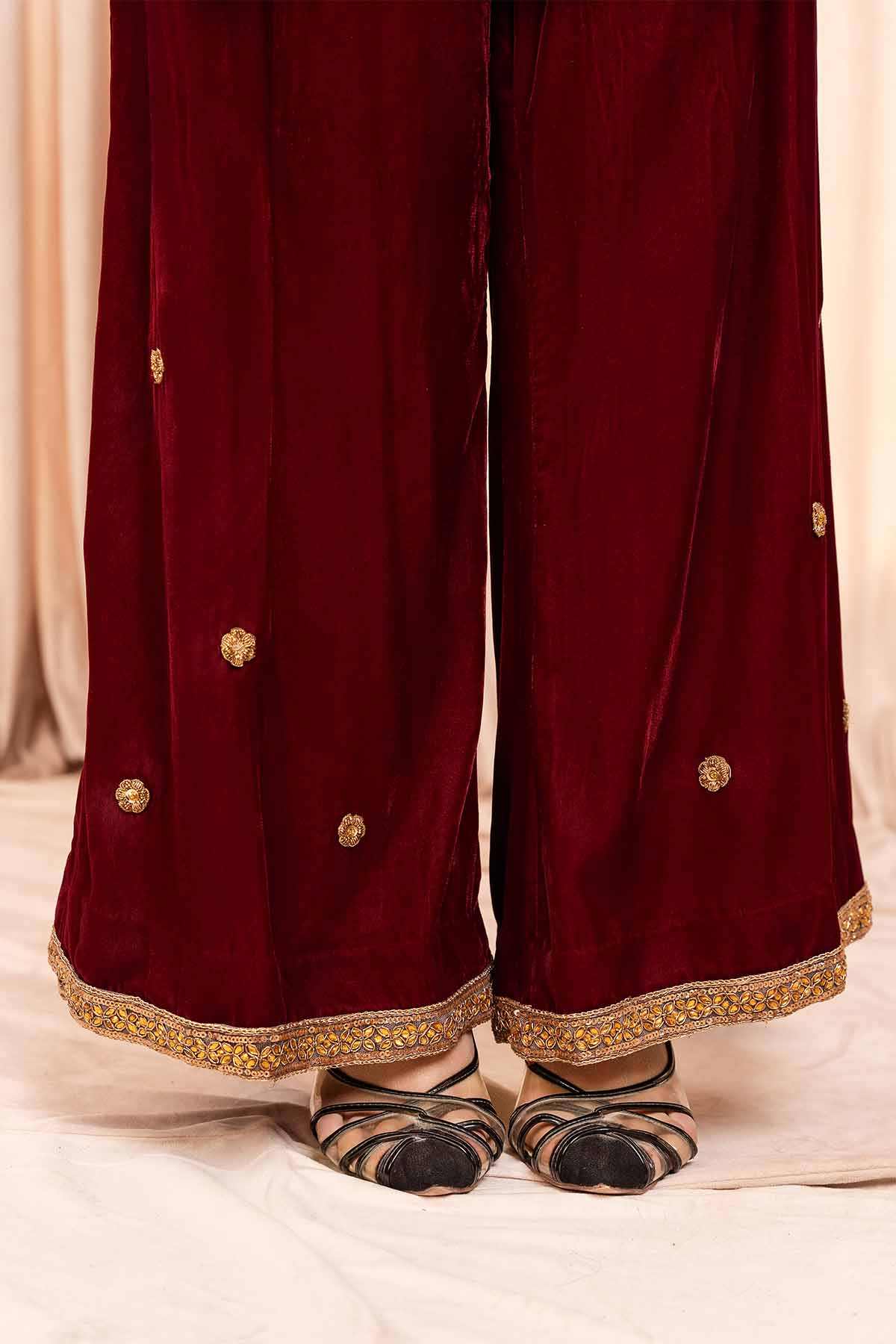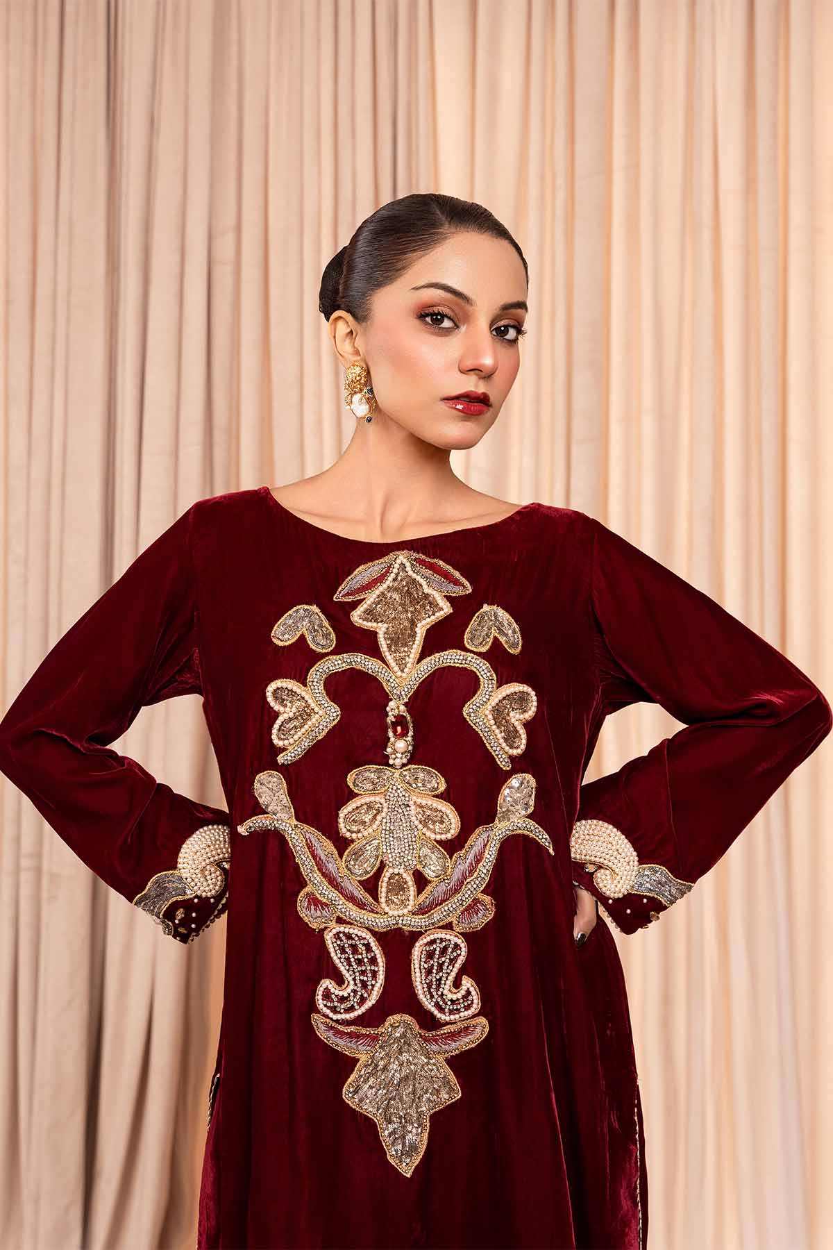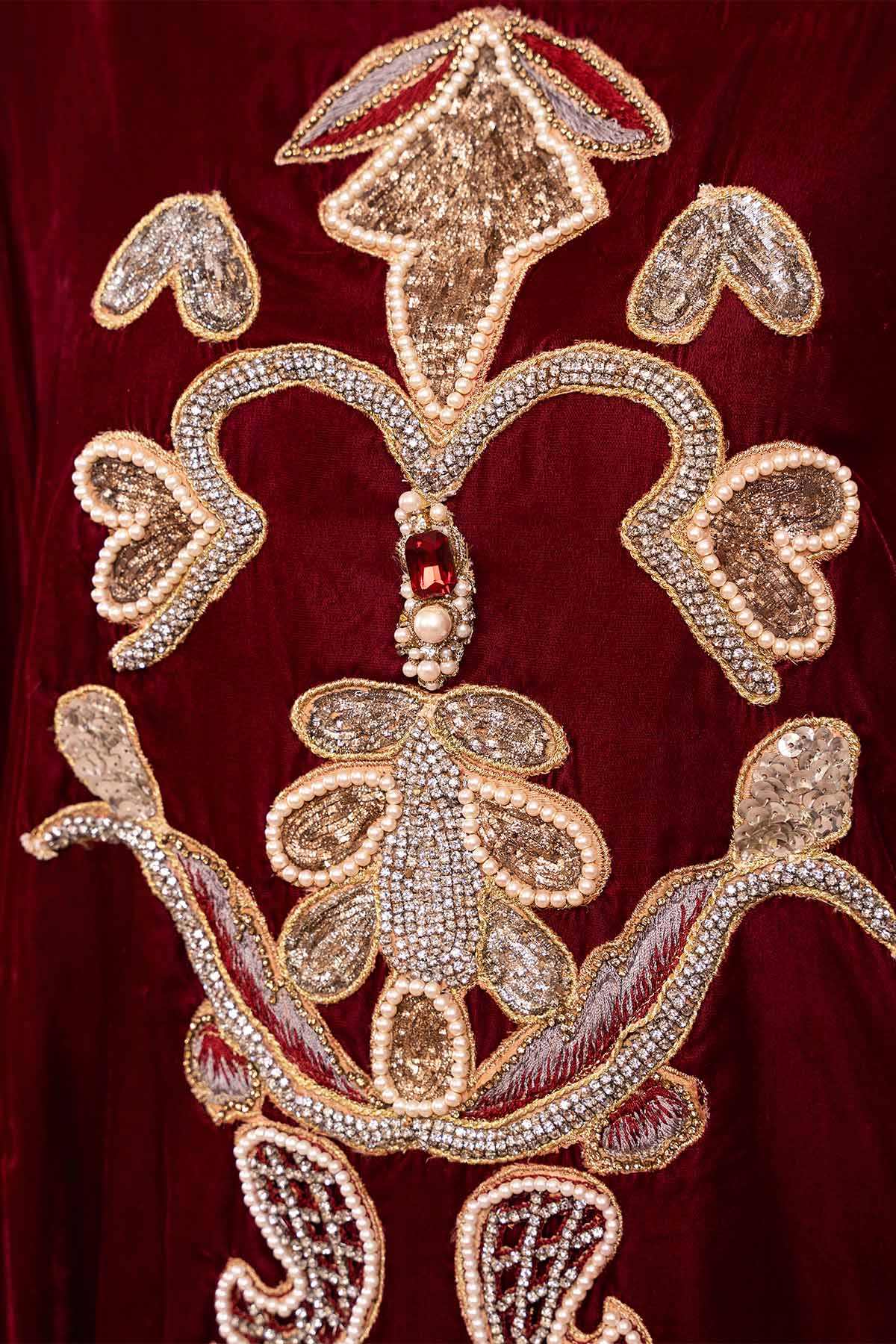 The dress is crafted from maroon micro 9000 velvet,a luxurious fabric with a soft,plush texture that has a rich sheen.The front and sleeves of the dress are lavishly embellished with stones and pearls,creating an eye catching and glamorous effect.The embellishments are arranged meticulously, forming intricate patterns.The dress is paired with trousers, and the lace work at the trouser bottom adds a touch of softness and intricate detail to the lower part of the outfit.This dress would be perfect for someone looking for a striking,regal outfit with a balance of opulent embellishments and delicate details.The velvet fabric,intricate stone and pearl work,and lace accents make it a standout choice for any formal or celebratory event.