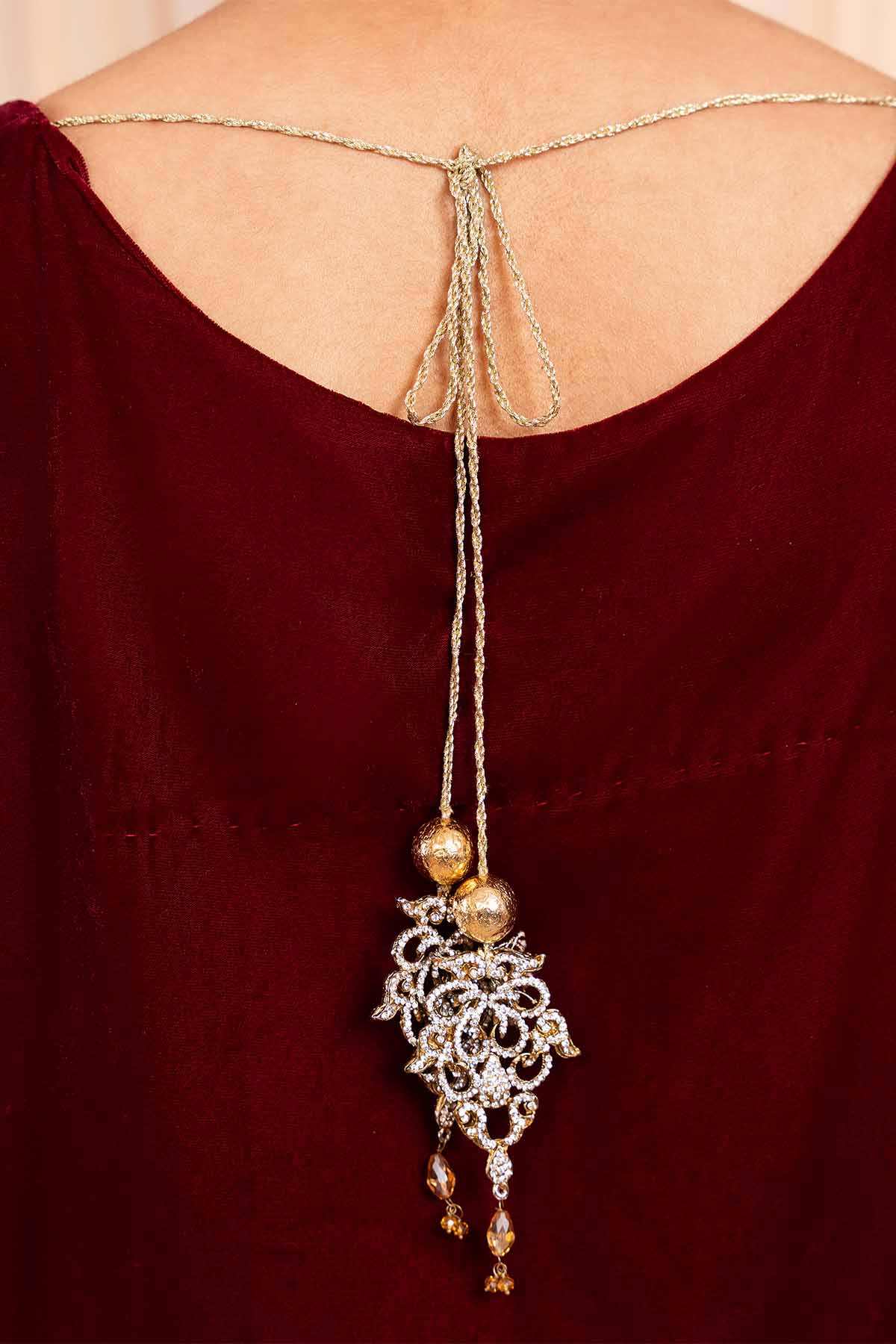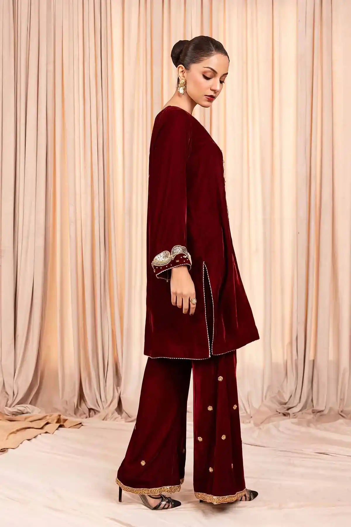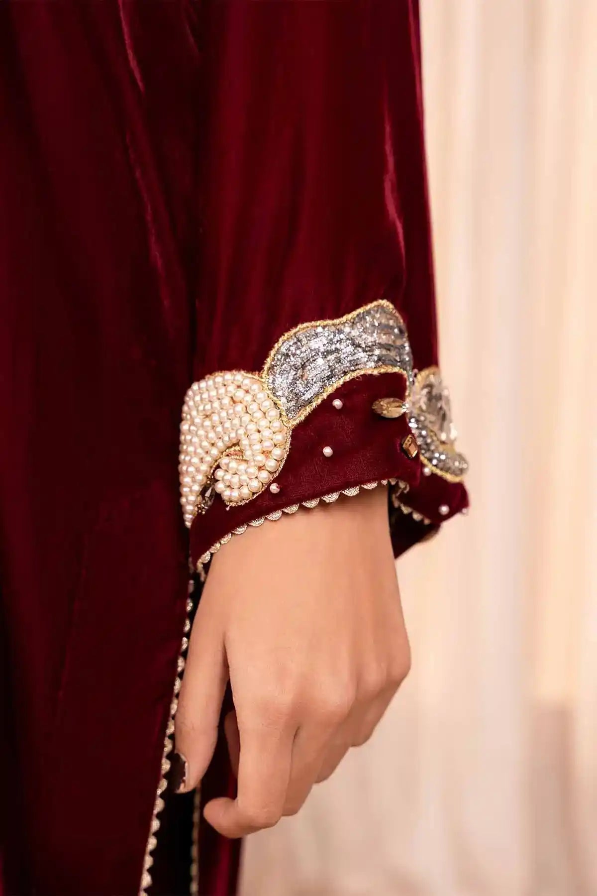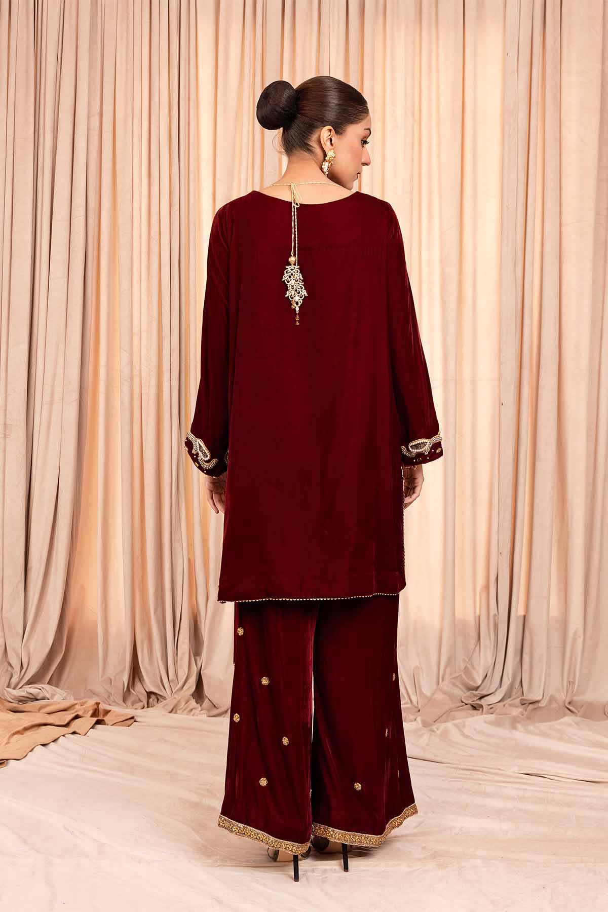 The dress is crafted from maroon micro 9000 velvet,a luxurious fabric with a soft,plush texture that has a rich sheen.The front and sleeves of the dress are lavishly embellished with stones and pearls,creating an eye catching and glamorous effect.The embellishments are arranged meticulously, forming intricate patterns.The dress is paired with trousers, and the lace work at the trouser bottom adds a touch of softness and intricate detail to the lower part of the outfit.This dress would be perfect for someone looking for a striking,regal outfit with a balance of opulent embellishments and delicate details.The velvet fabric,intricate stone and pearl work,and lace accents make it a standout choice for any formal or celebratory event.