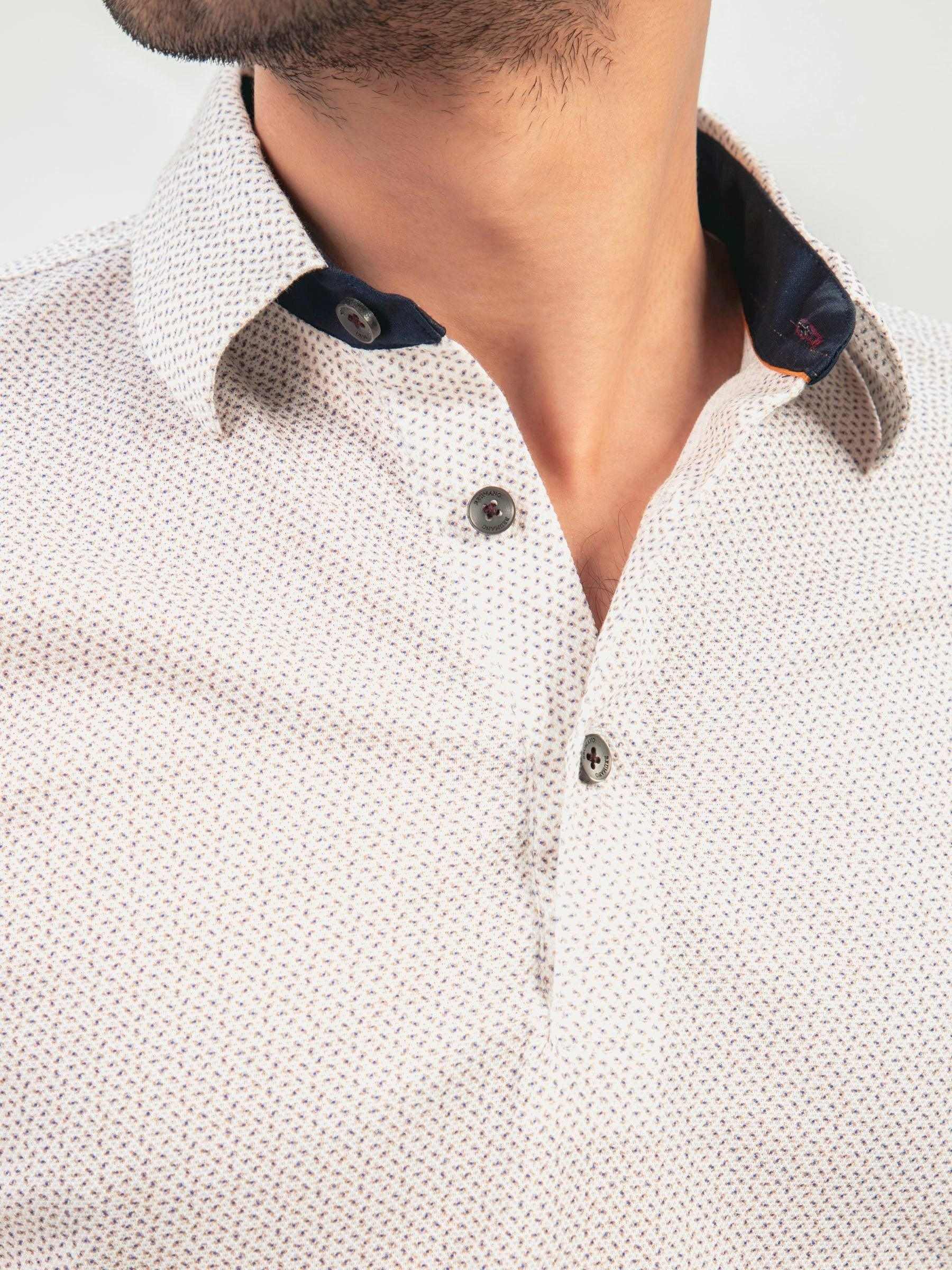 Step into the summer season with our mens white & beige printed polo. Featuring a playful pattern of brown and blue dots that adds a touch of casualness to your wardrobe. This refined and light-weight polo is a versatile addition to your warm-weather collection. Finished with inner collar navy blue detailing