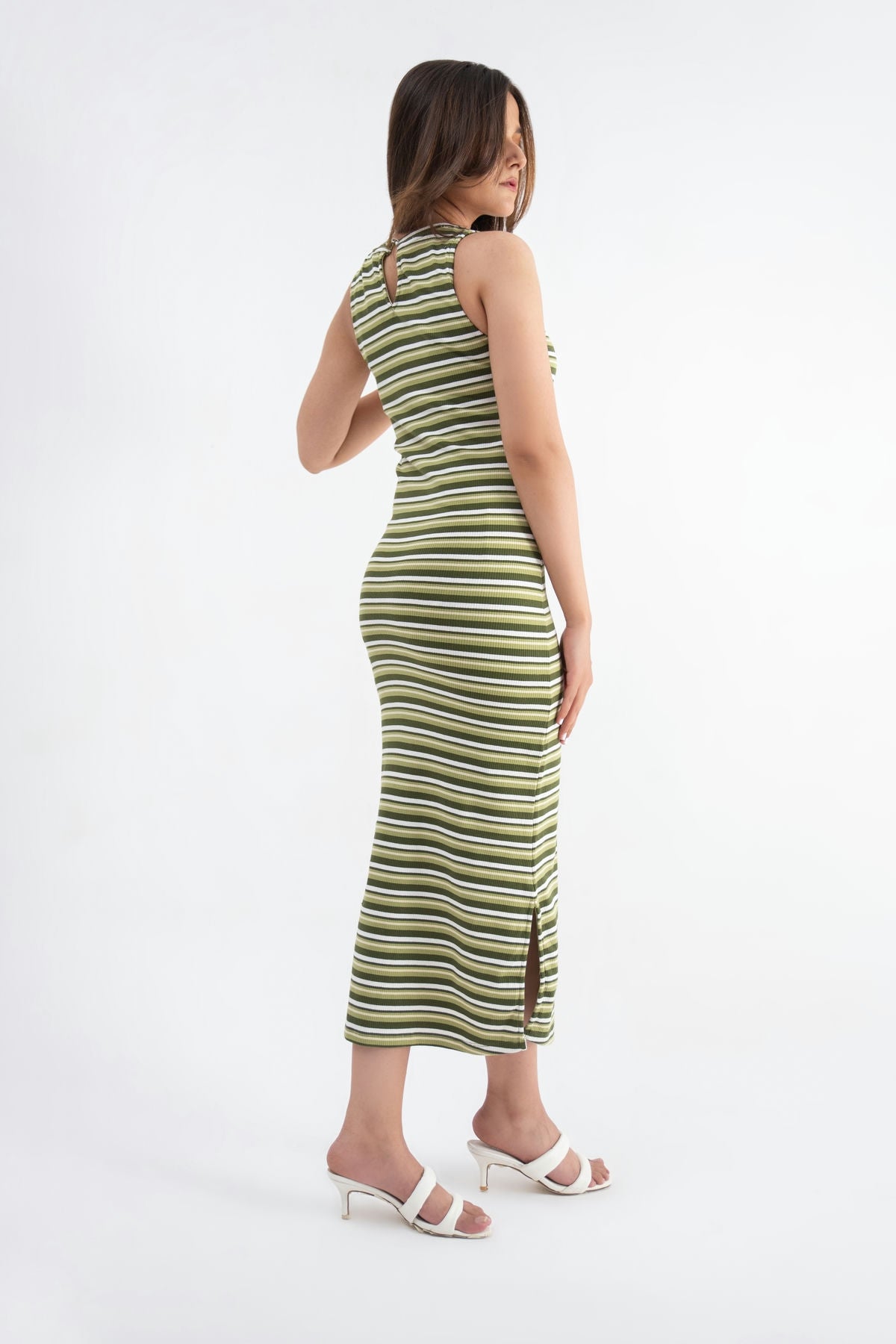 95% Cotton 5% Lycra. Sleeveless Dress With Halter Neckline, Button Detail On Back Of Neckline And Slit At Hem.