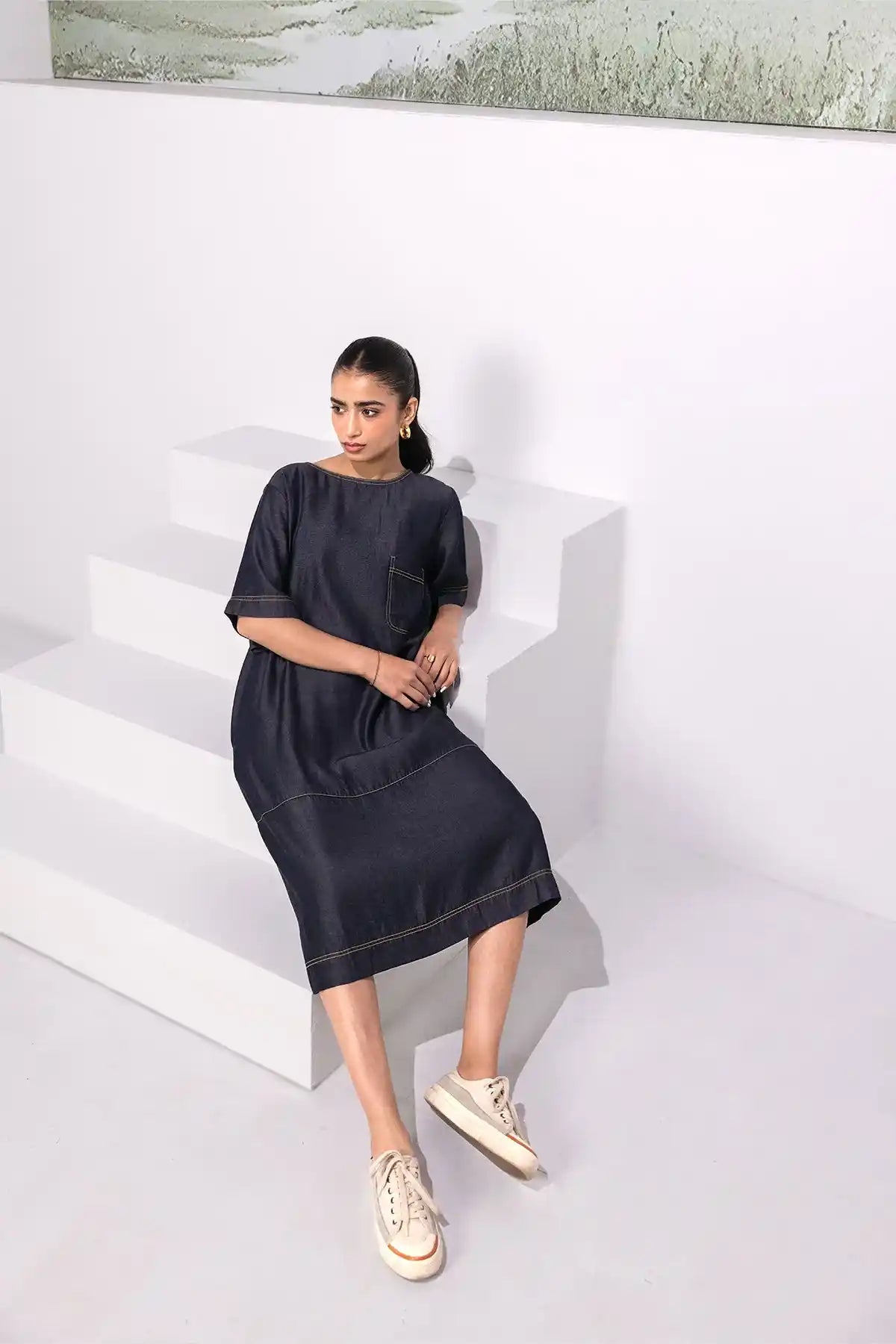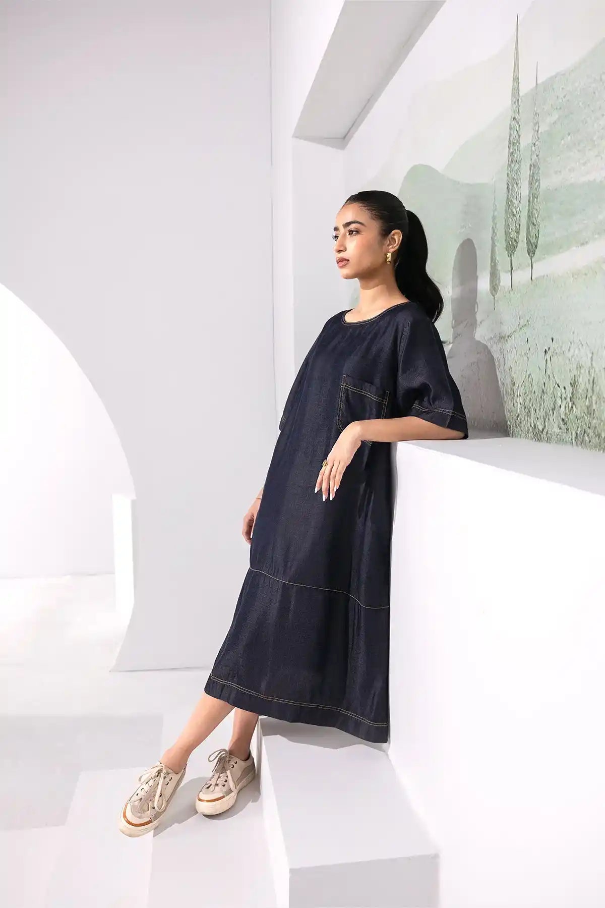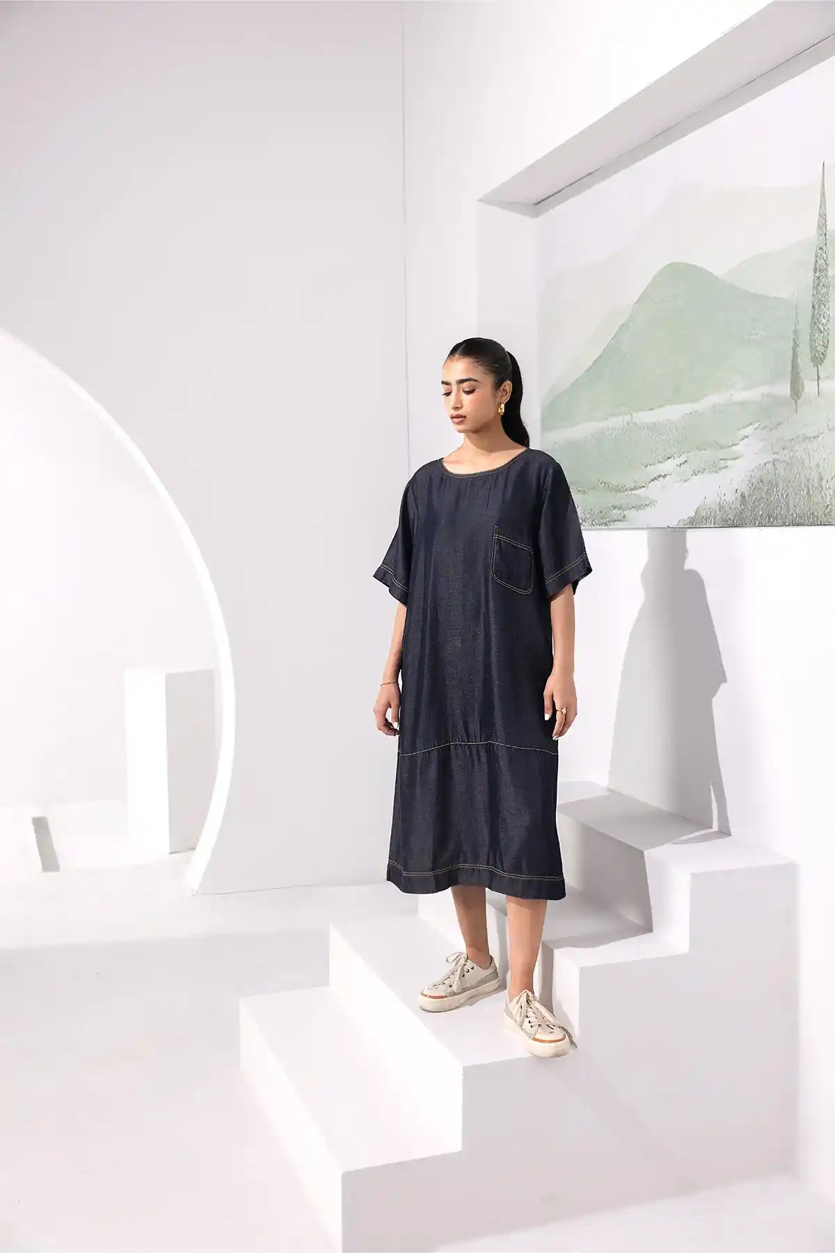 100% Lyocell. Casual And Trendy Crew Neck Dress. Short Sleeves With Overstitch Detailing. Featuring Front Patch Pocket With Overstitch Detailing.