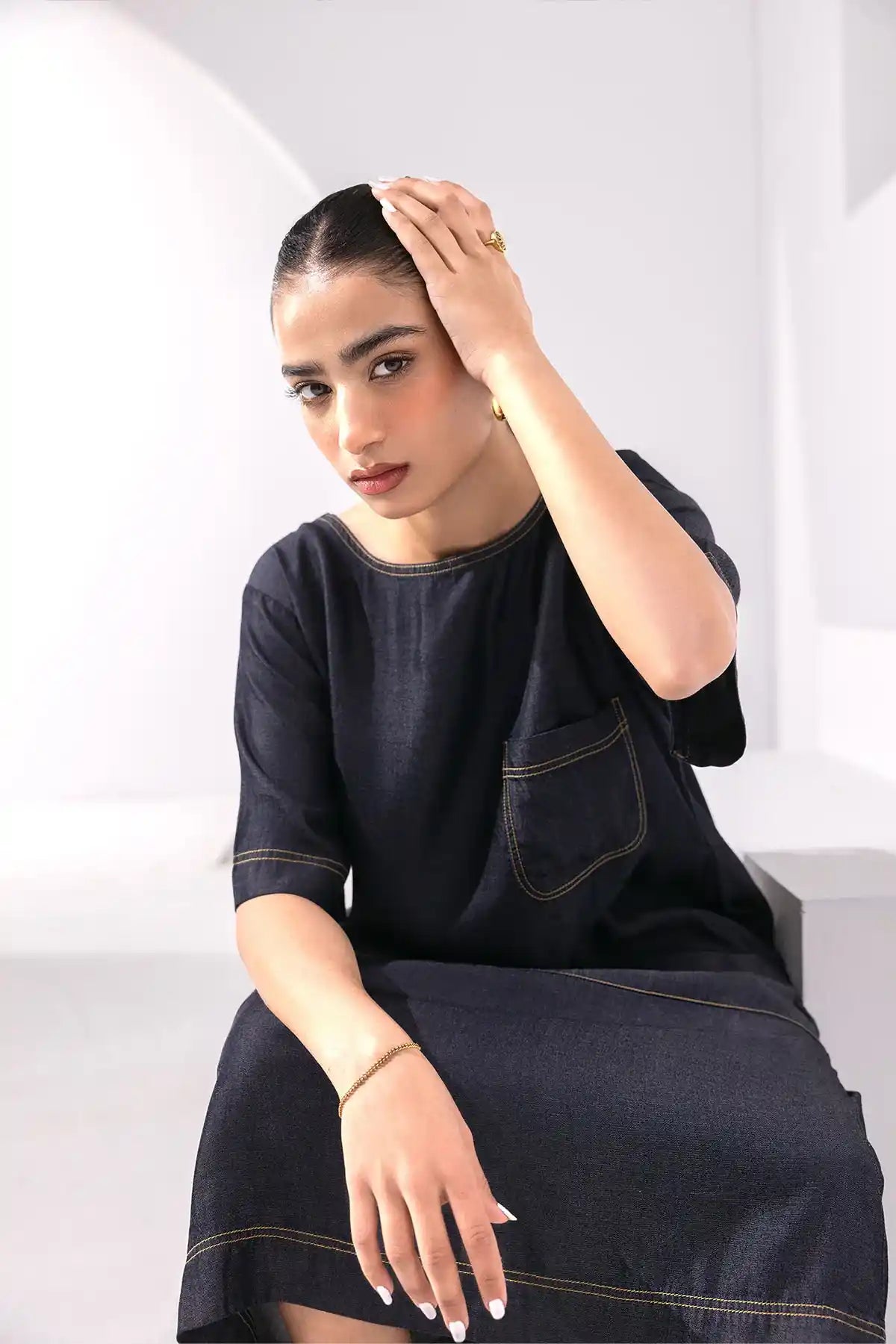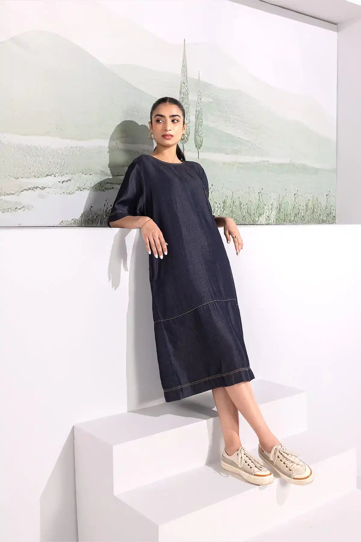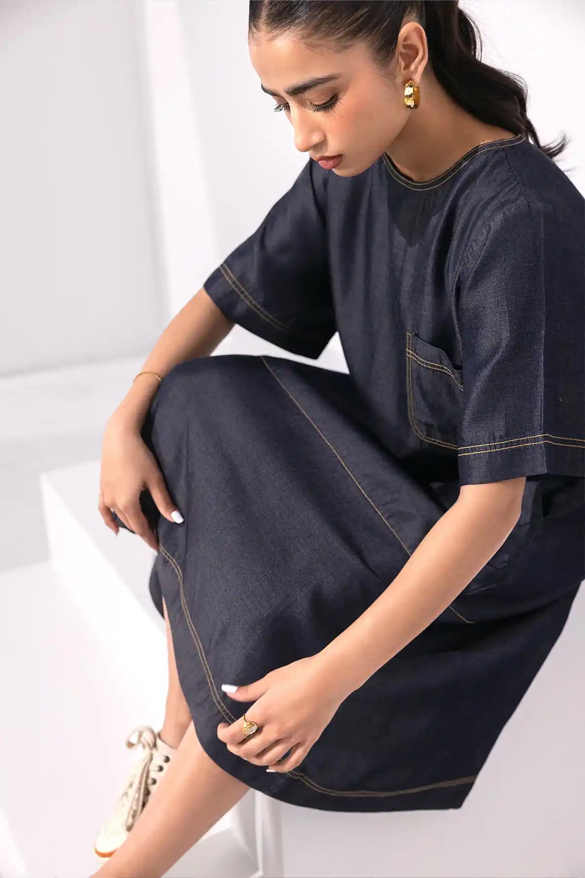 100% Lyocell. Casual And Trendy Crew Neck Dress. Short Sleeves With Overstitch Detailing. Featuring Front Patch Pocket With Overstitch Detailing.