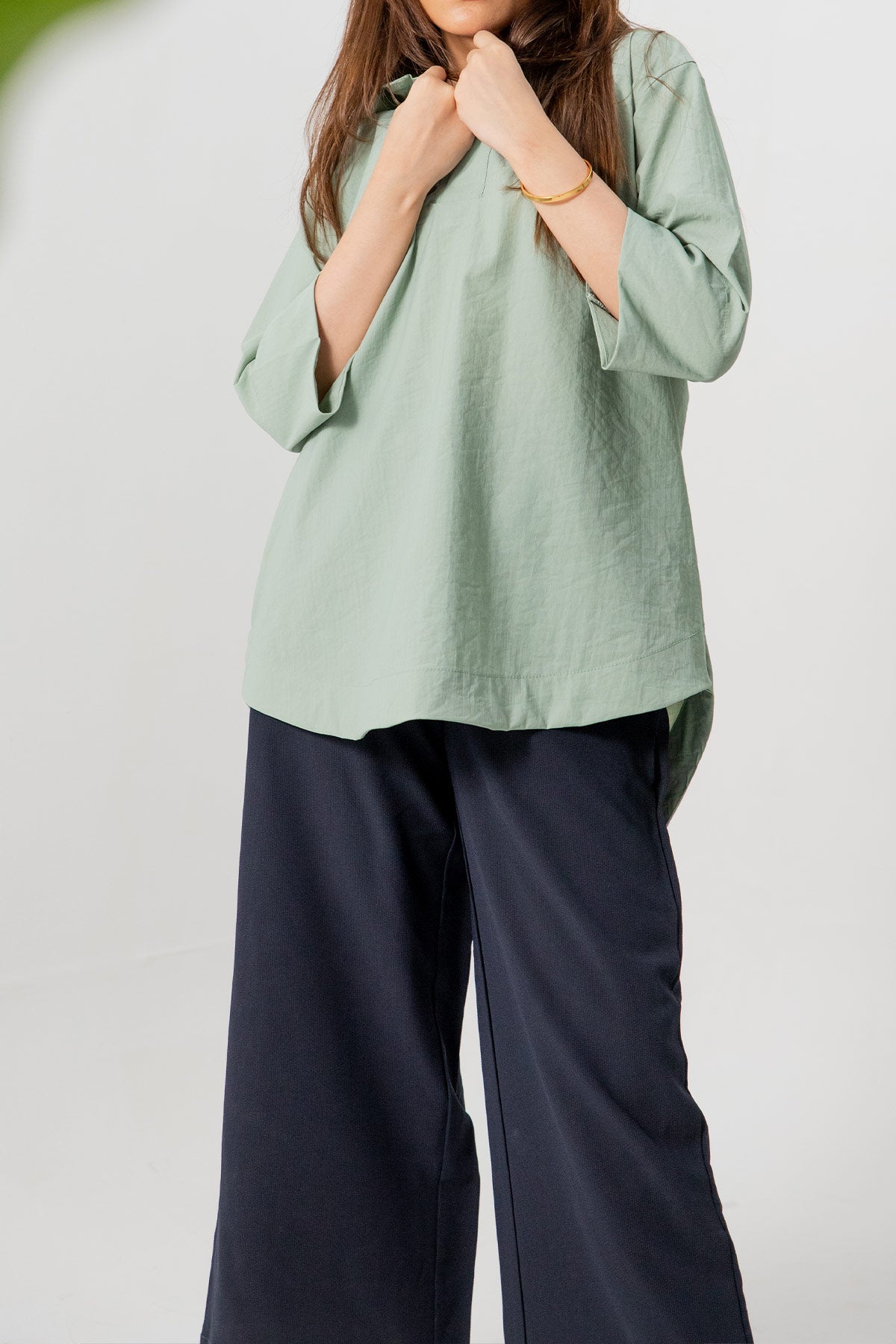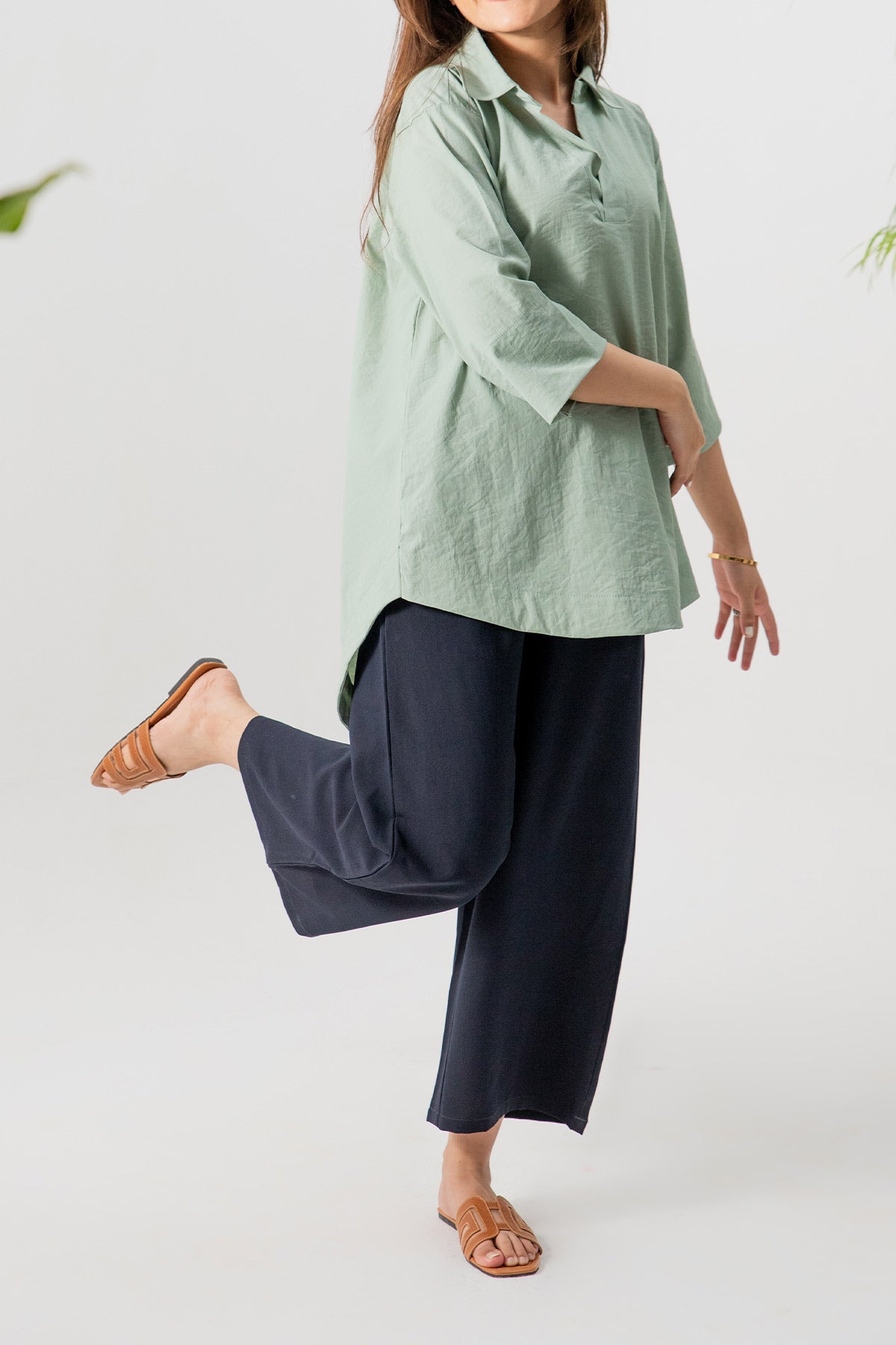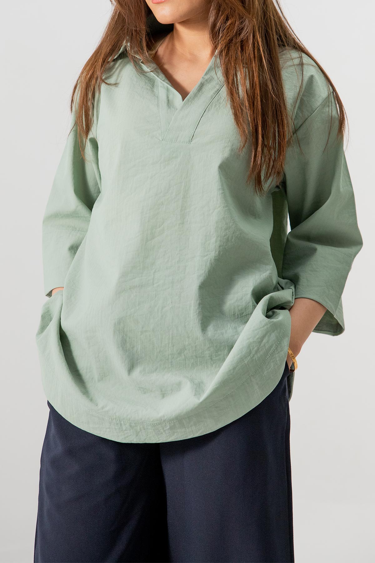 100% BLENDED. Solid Textured Poly-Cambric top with v neckline, regular collar and three quarter sleeves.
