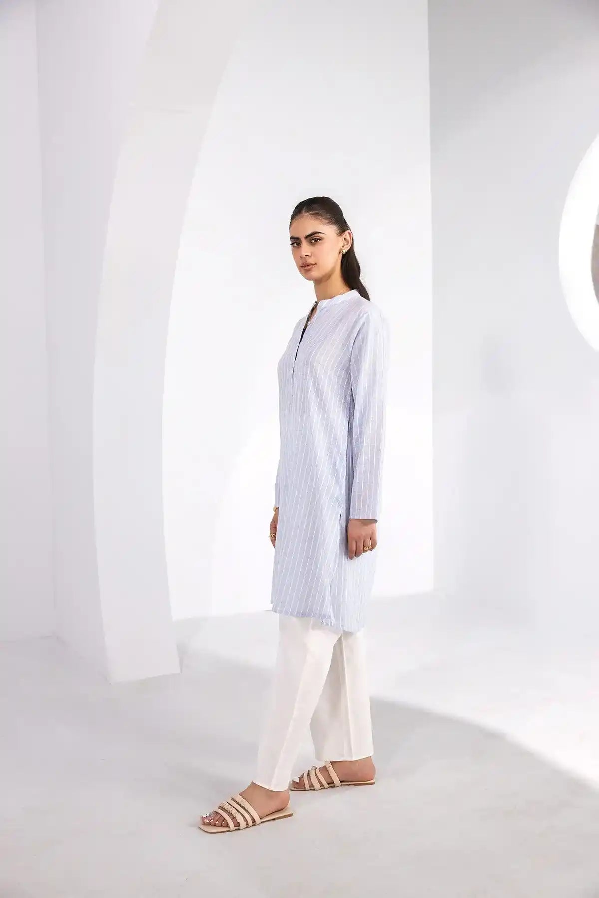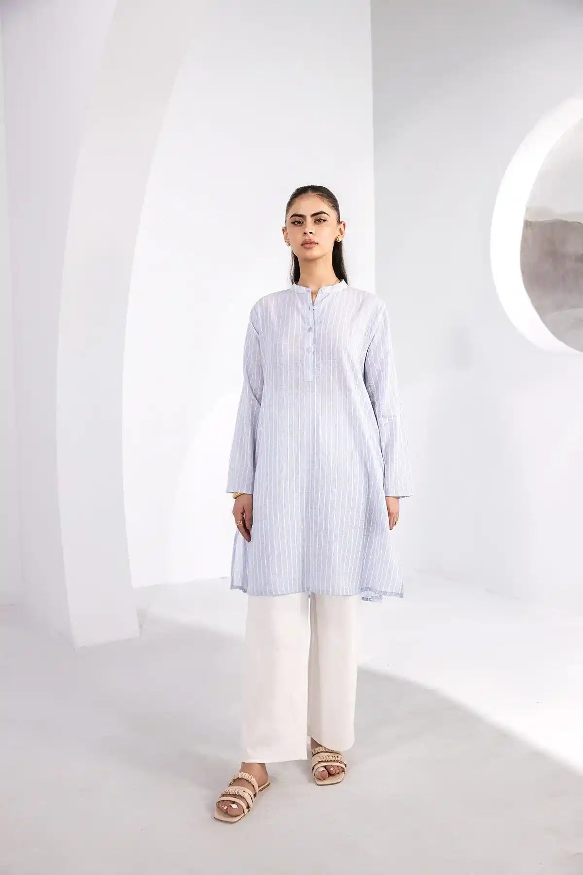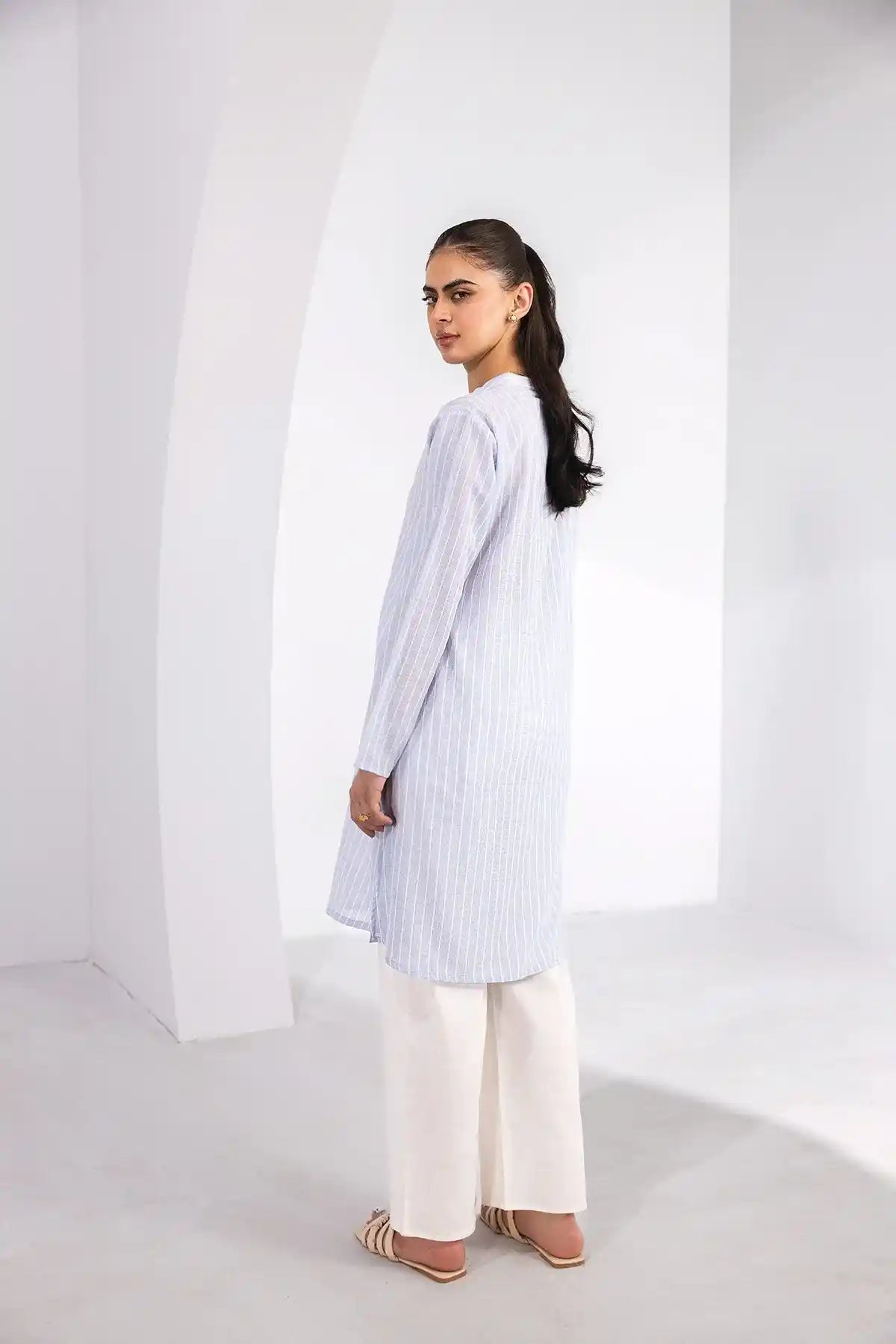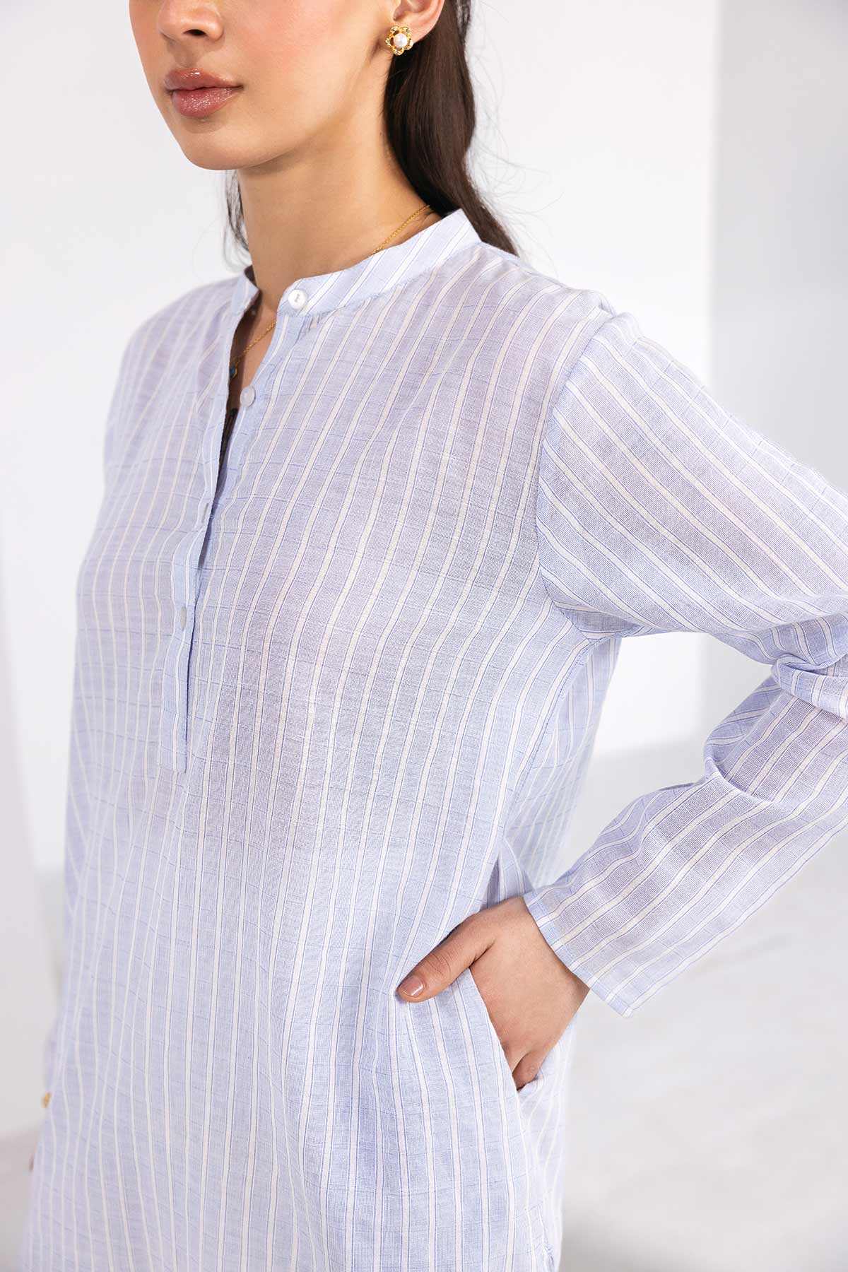 100% Blended. Classic Stripe Print Relaxed Fit Tunic Featuring Band Collar With Front Down Closure. Long Sleeves. Sideseam Slits. Straight Hem. Model’s Height: 5'5ft, Model’s Size: Small