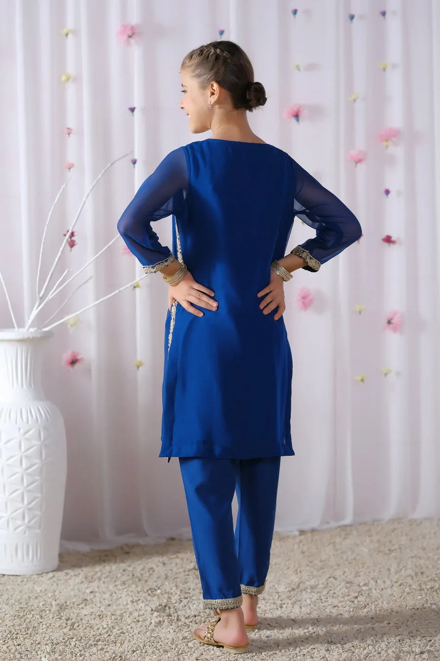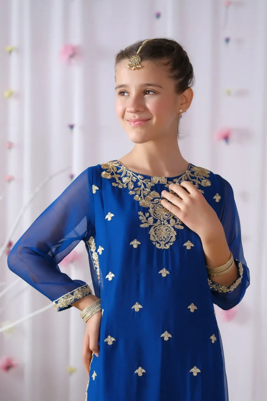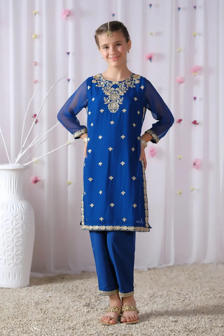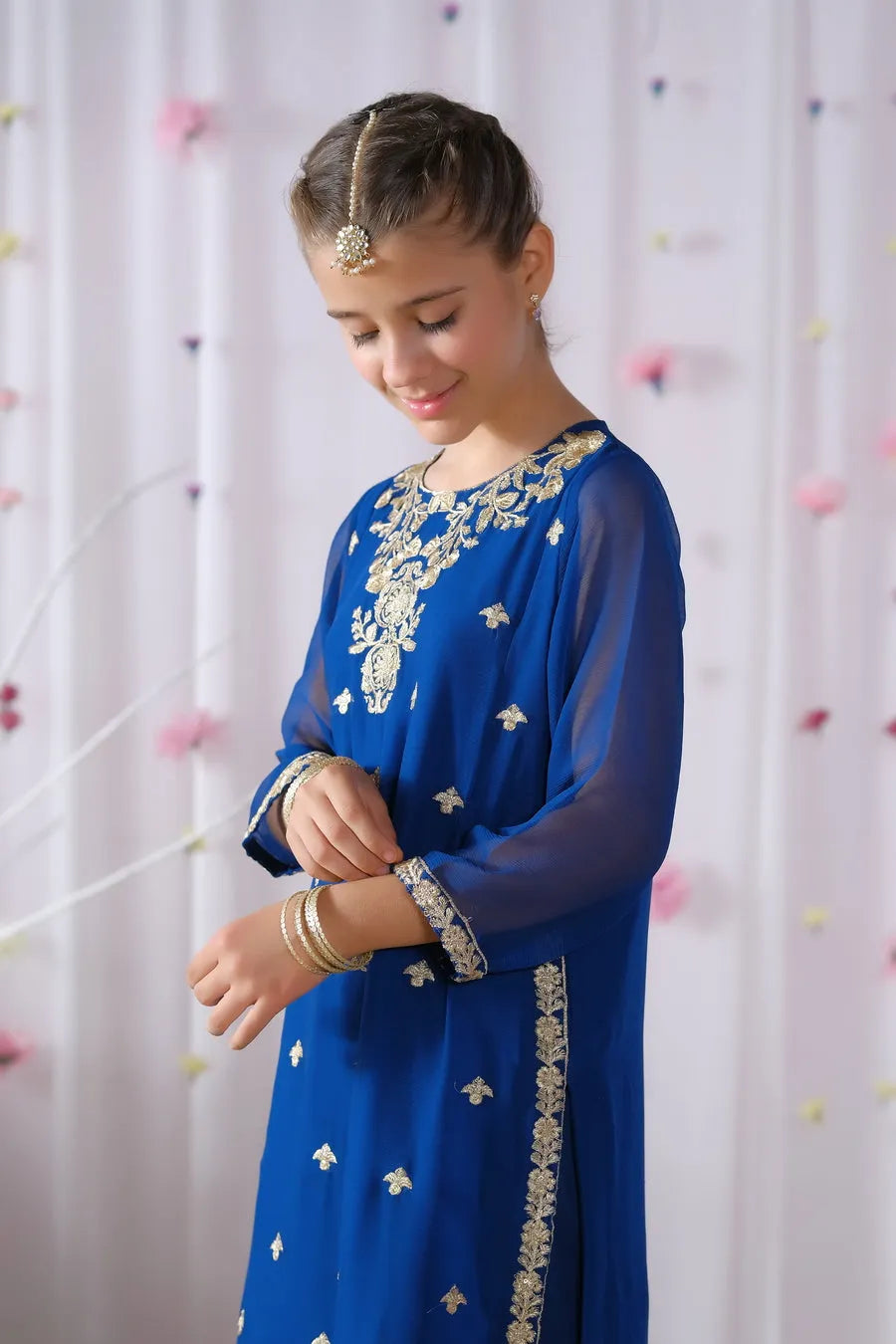 Introducing "Zahraa," a graceful blue two-piece ensemble for girls that radiates sophistication. The knee-length top pairs beautifully with straight pants, offering a chic and versatile look. Adorned with intricate golden embroidery, this outfit adds a touch of elegance to any occasion, making your little one shine like a star named Zahraa, meaning "blooming flower."