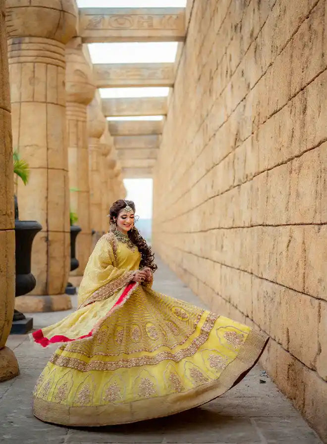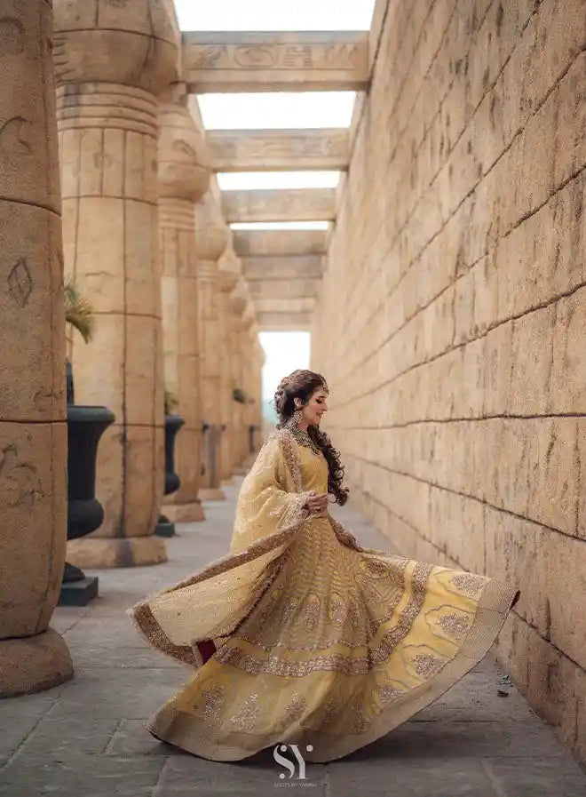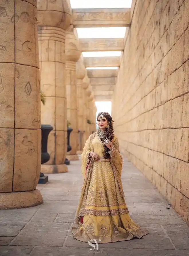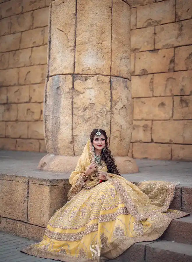 This vibrant 4-piece Mehendi bridal ensemble features a graceful maxi, a voluminous can-can lehenga, an elegant dupatta, and a stylish pouch, all crafted from luxurious organza in a cheerful yellow hue.