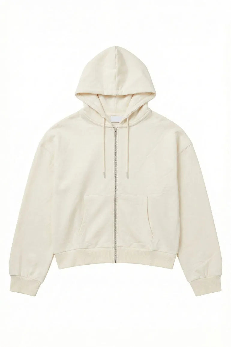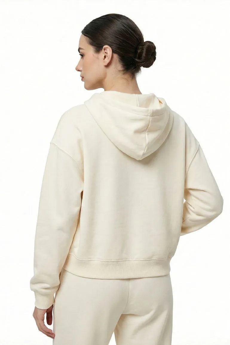 Clean jet stream hoodie jacket for women featuring a full front zip, adjustable hood, and practical side pockets. Designed with a soft feel and relaxed fit for everyday comfort. Perfect for casual layering, travel, and off-duty styling.