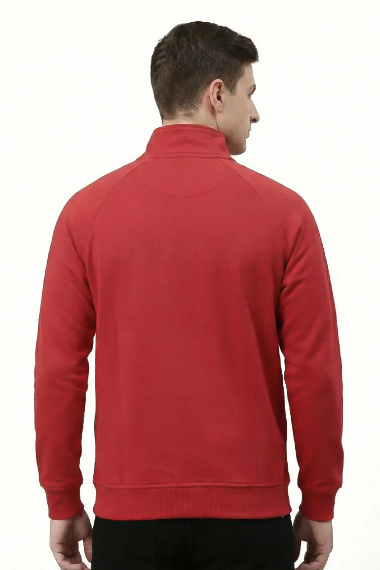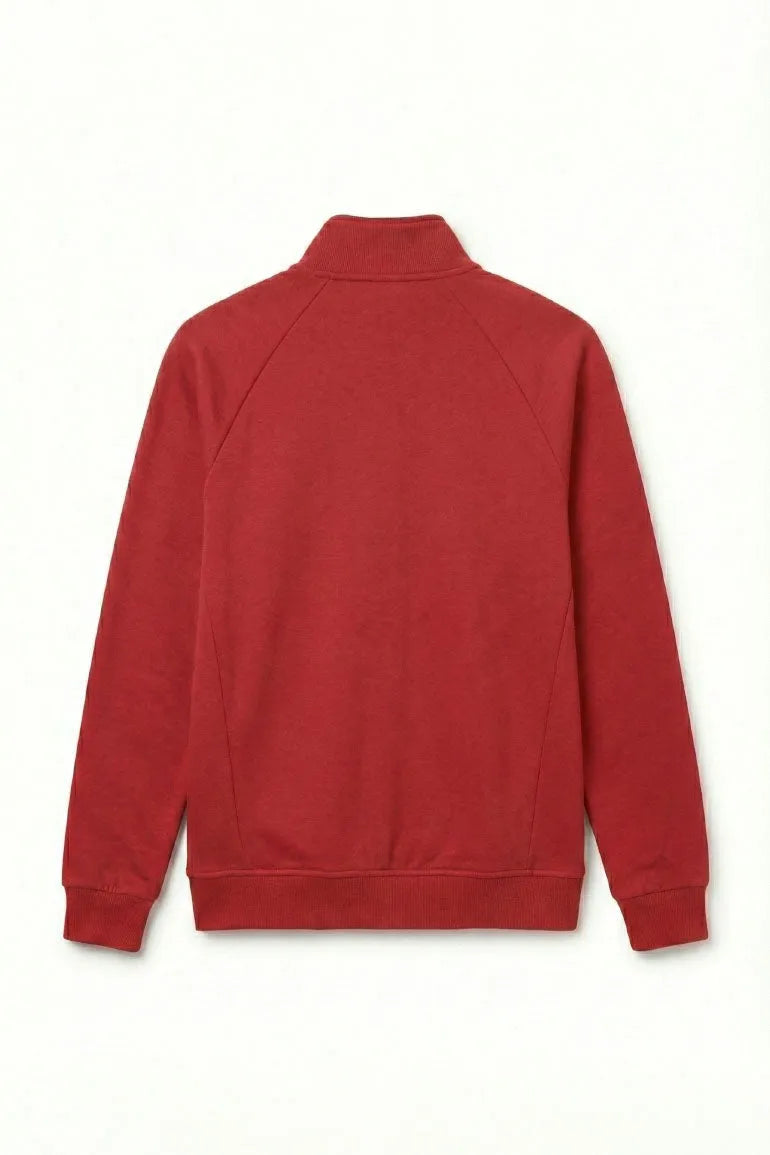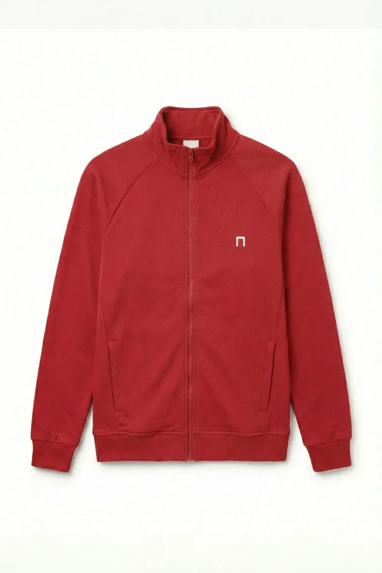Classic tango red zip-up sweat jacket for men designed with a stand collar and front zipper closure. Features a minimal chest logo, side pockets, and ribbed cuffs for a clean, comfortable fit. Ideal for casual layering and everyday wear.